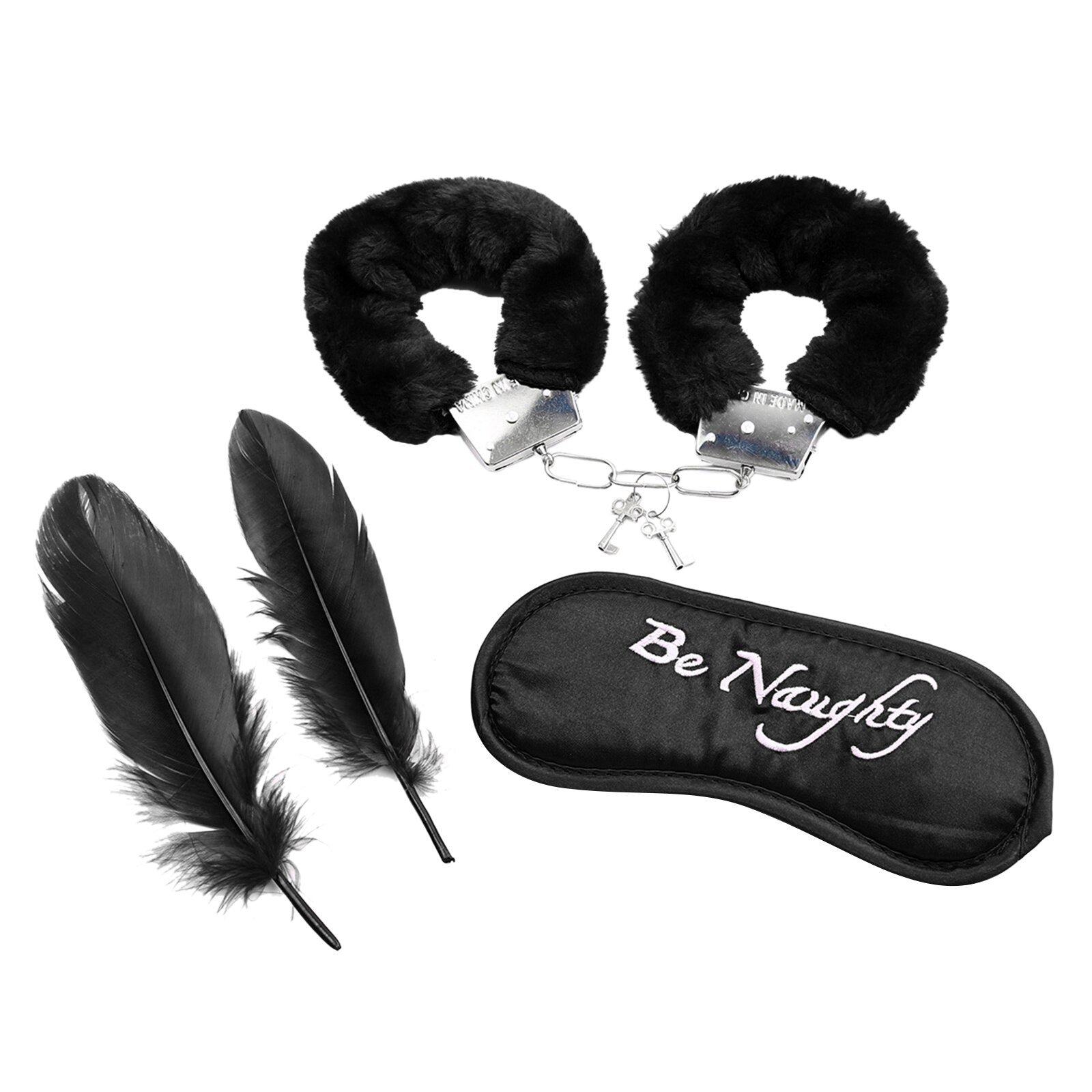 Set include eye mask, feather and plush covered handcuffs with keys.
