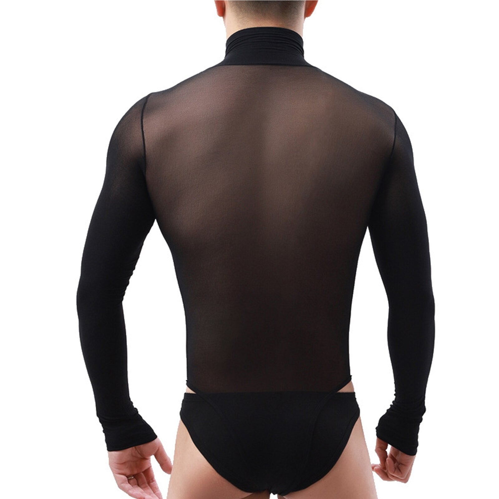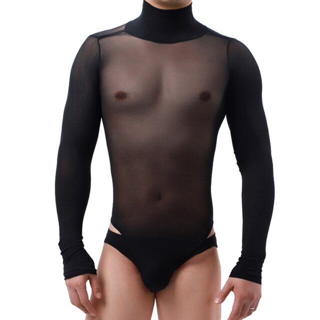Men See-through Long Sleeve High Neck Bodysuit/Two-Piece Outfits Vest Briefs.