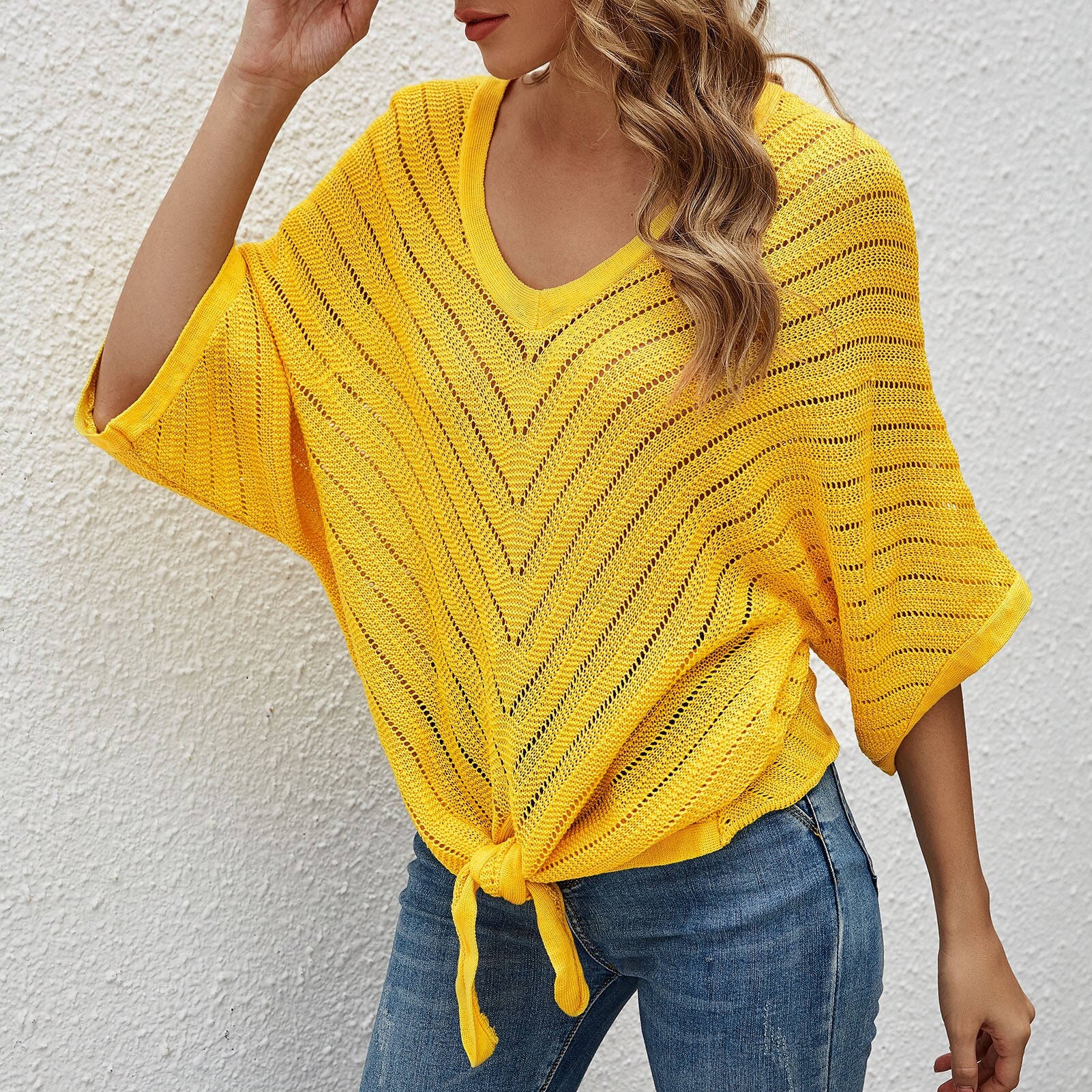 Knit shirt has striped pattern, batwing sleeves, knot hem, V-neckline and loose silhouette. It's comfortable to wear, fit for casual wear, shopping, vacation, holiday and date.