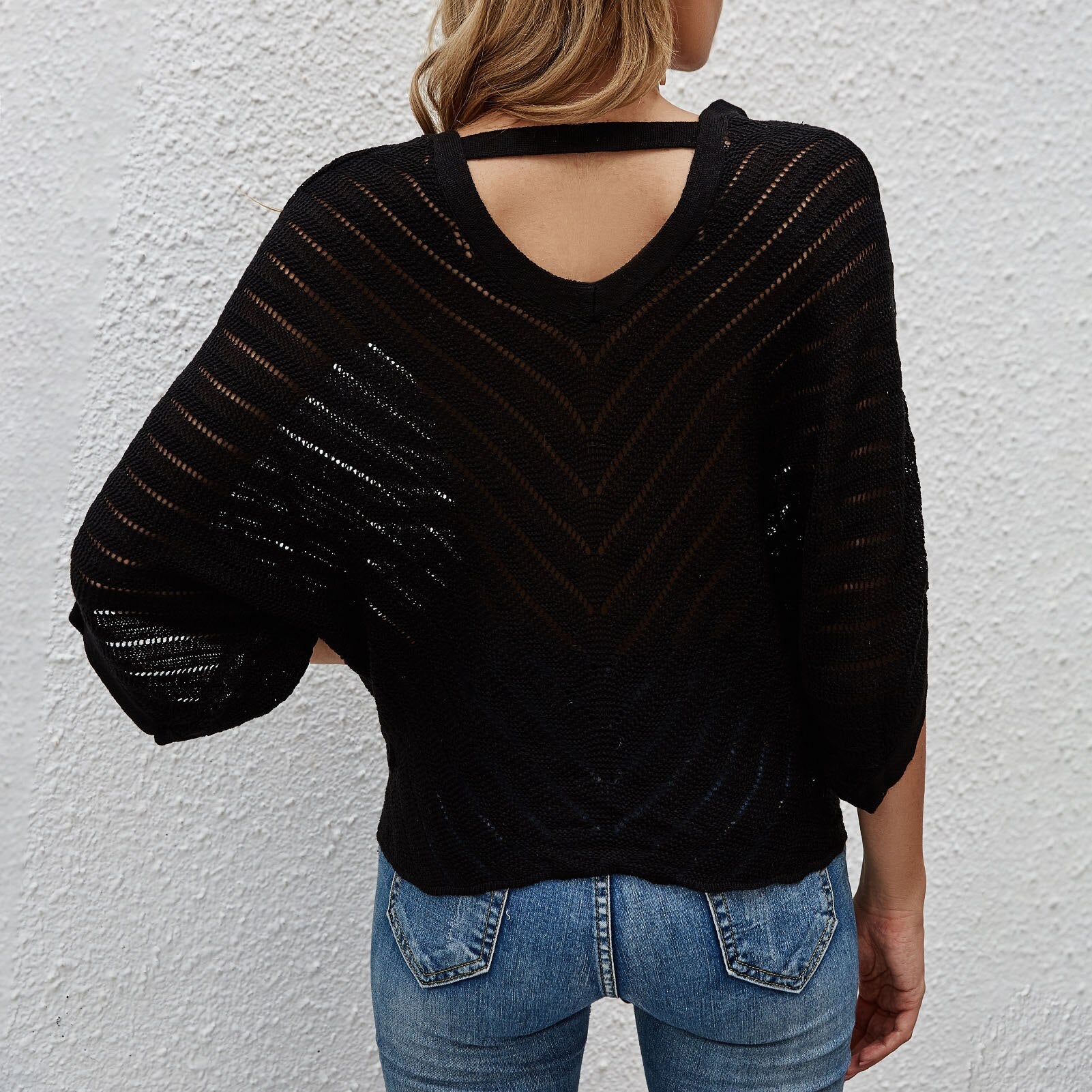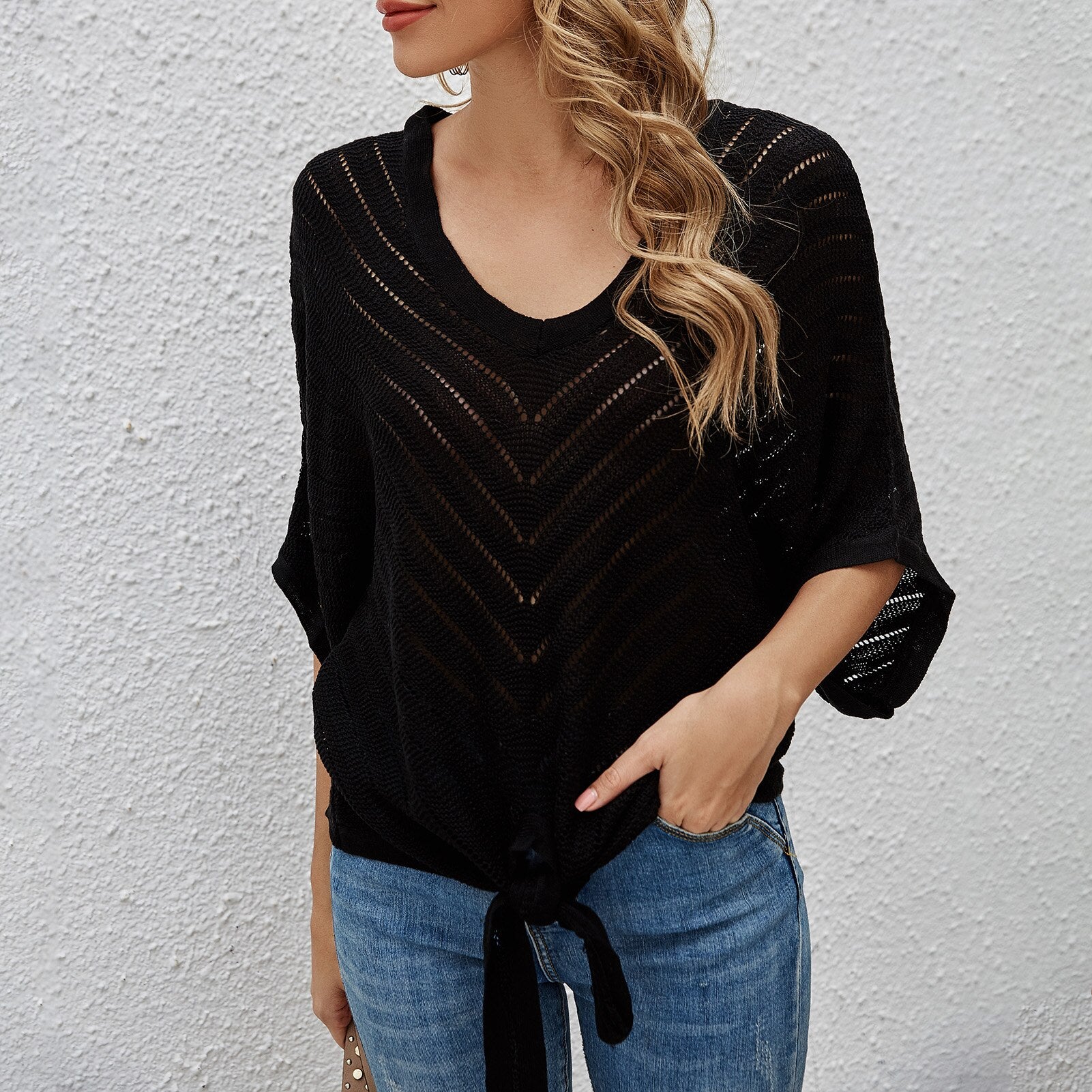 Featuring V-neck, batwing sleeve, knot hem and bandage at back.