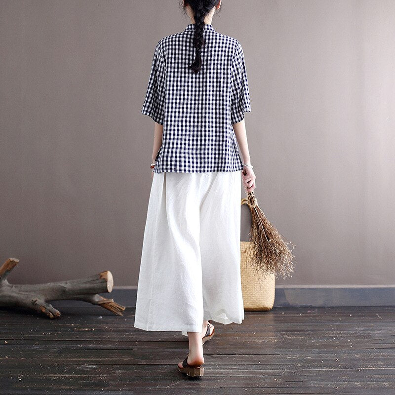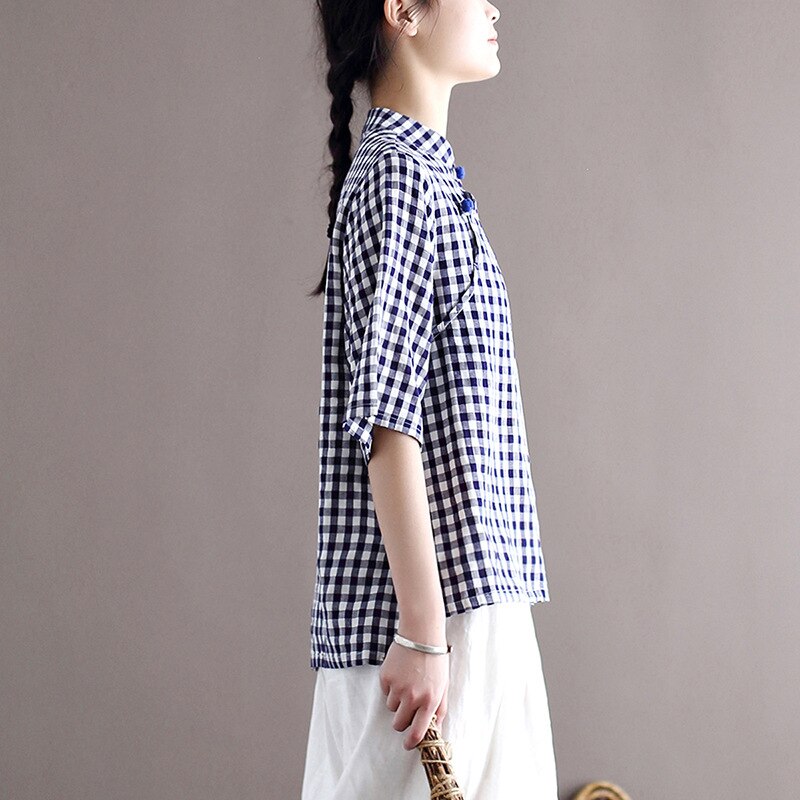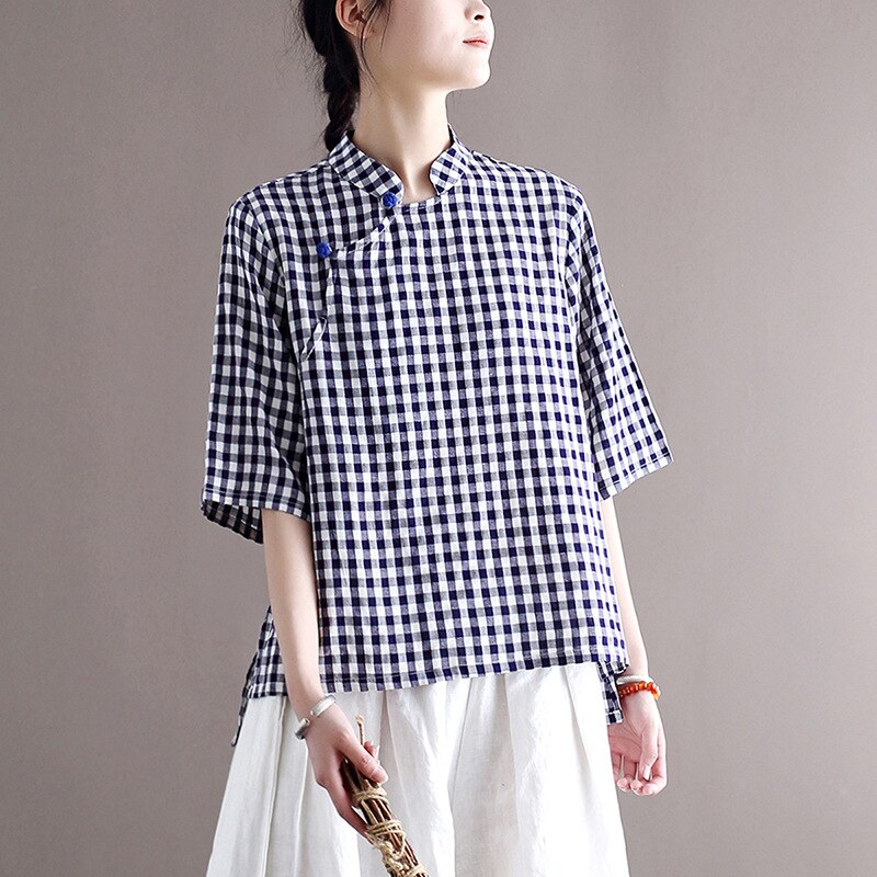 FairyNatural Ladies Plaid Blue Shirts And Tops 2021 Summer New Women Cotton Linen Stand Collar Retro Blouses Clothes Button