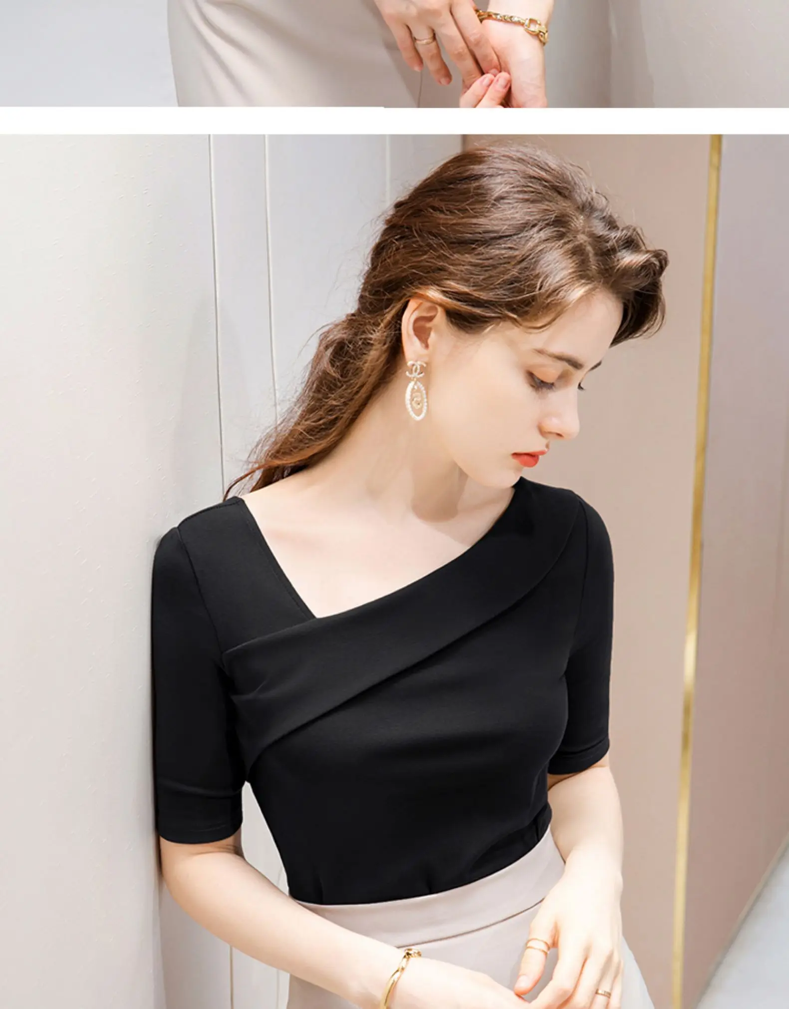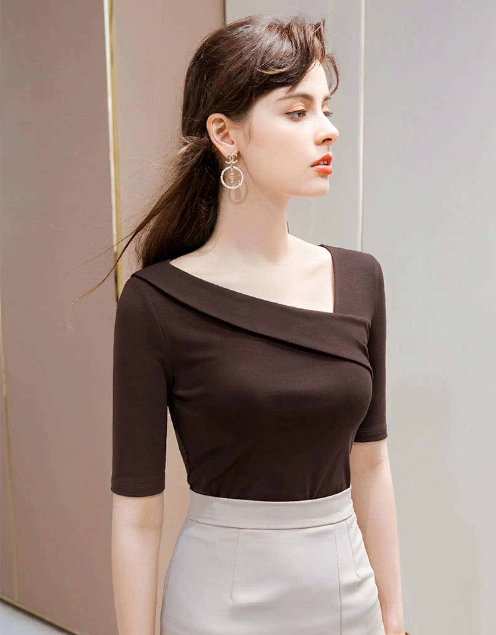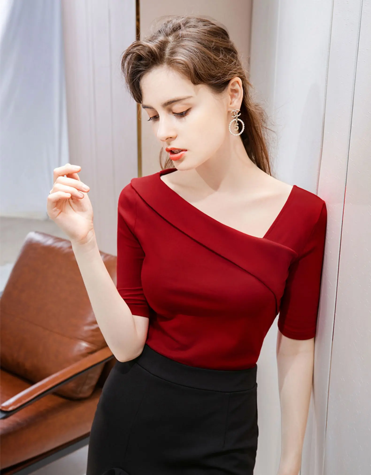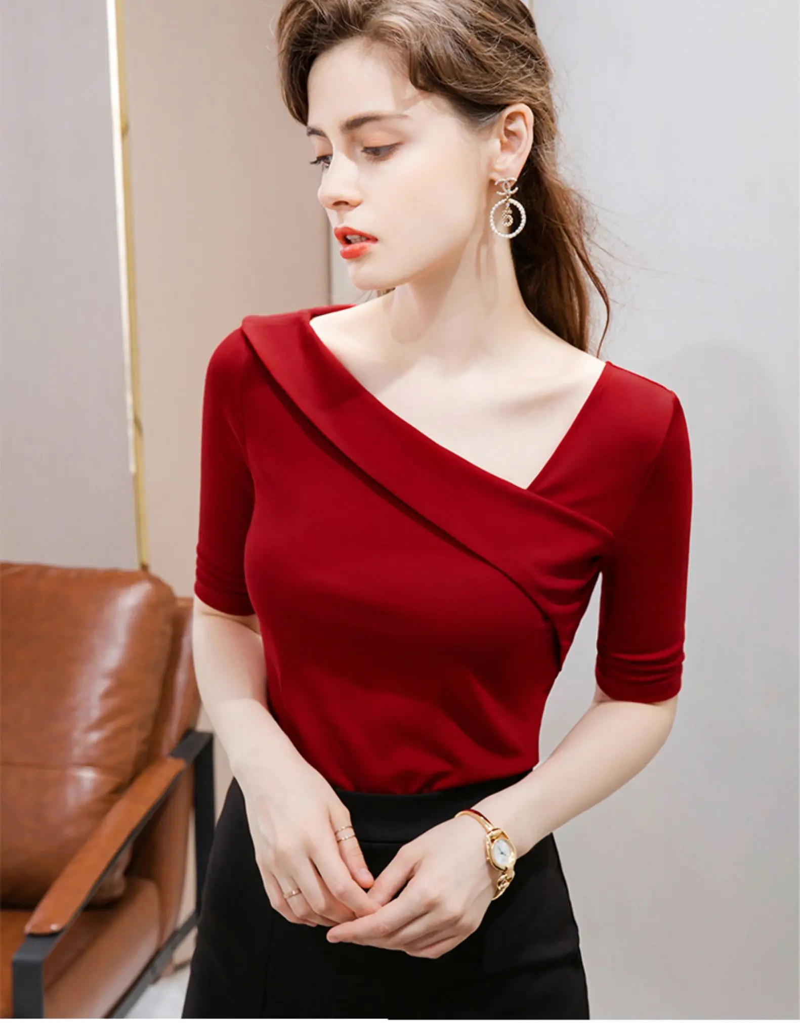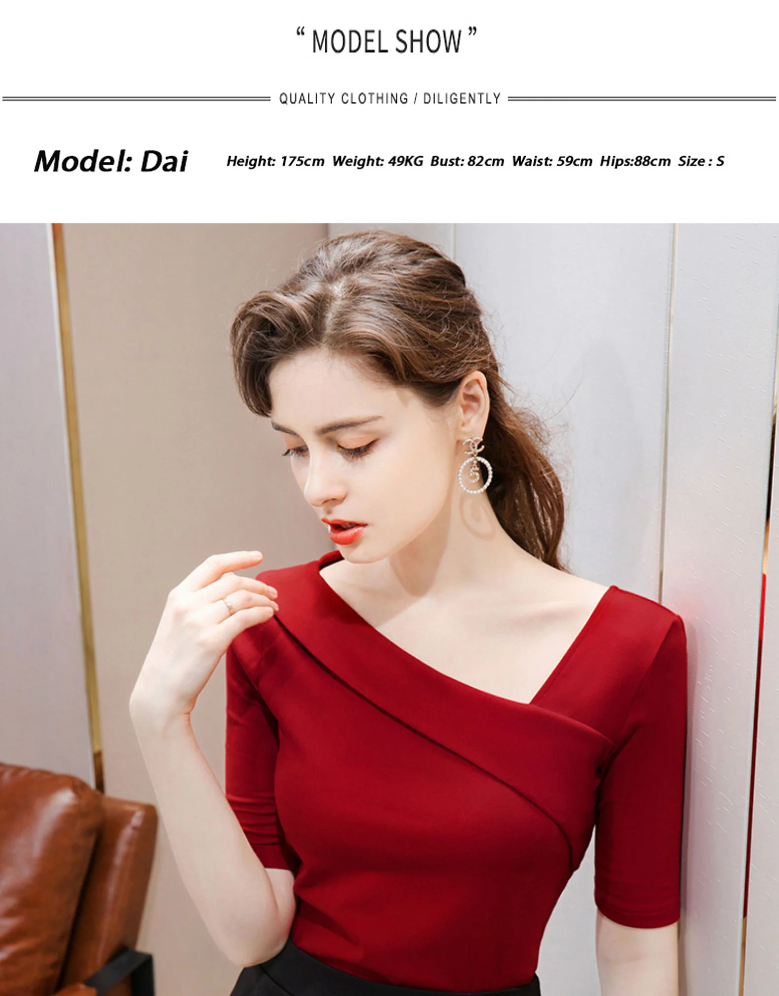 Great Discount Women Slim T Shirts Korean Casual Half Sleeved Oblique Neck Female Top Tees Limited Time / Quantity Red