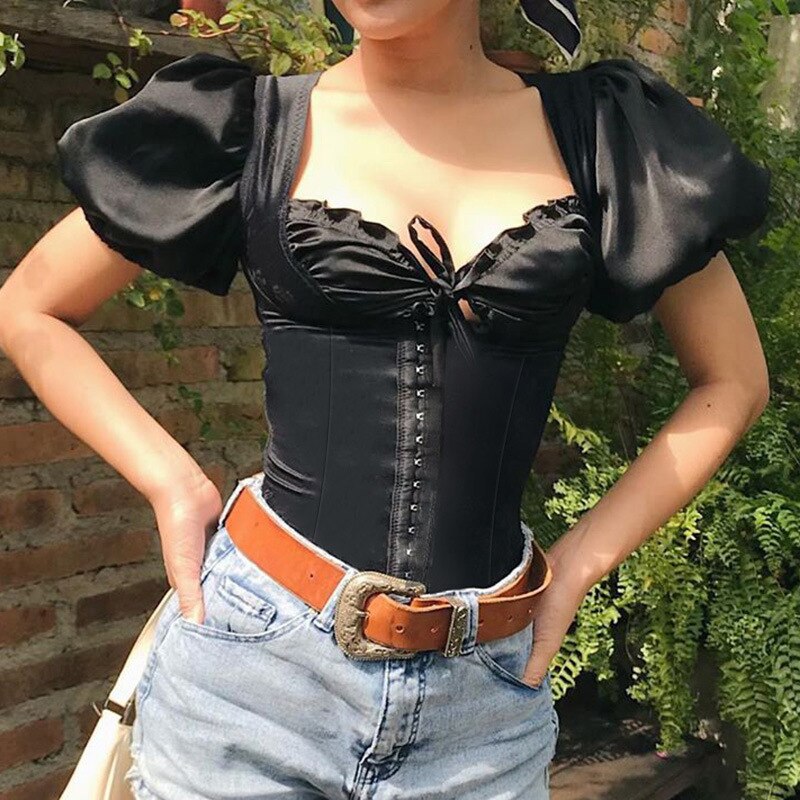 Puff Sleeve T-shirts Ladies Summer Short Sleeve Bandage Black White Slim Cropped Top Casual Elegant Bow Square Collar 2022 New