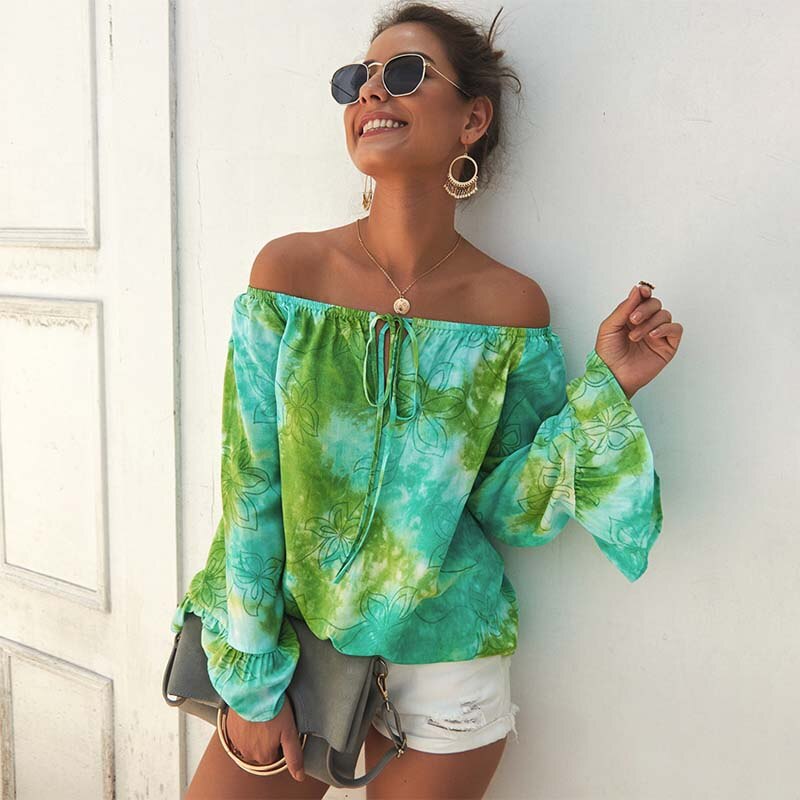 Summer Printed Shirt Long Sleeve Sexy Strapless Blouses Women Elegant Slim-fitting Slash Neck Tops Street Ladies Blouse