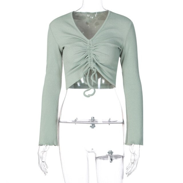 V-Neck Flare Sleeve Long Drawstring Slim Purple Crop Top Pleated Solid Simple Sweet T Shirts Women Casual Autumn Tops