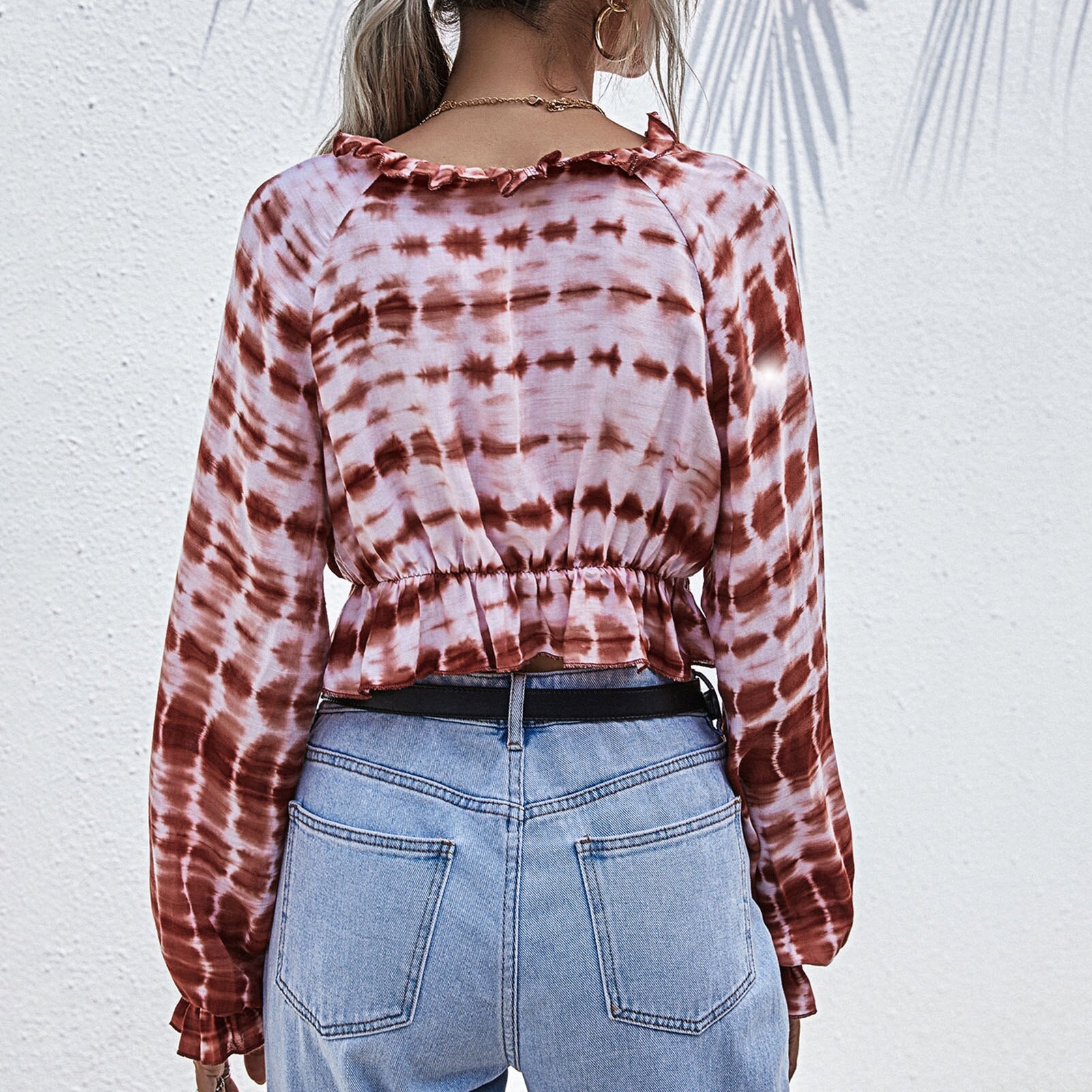 This tie dye print cardigan with frilled V-neck, front drawstring and ruffle hem is eye-catching. Pair it with shorts, skirts and jeans for street and party.