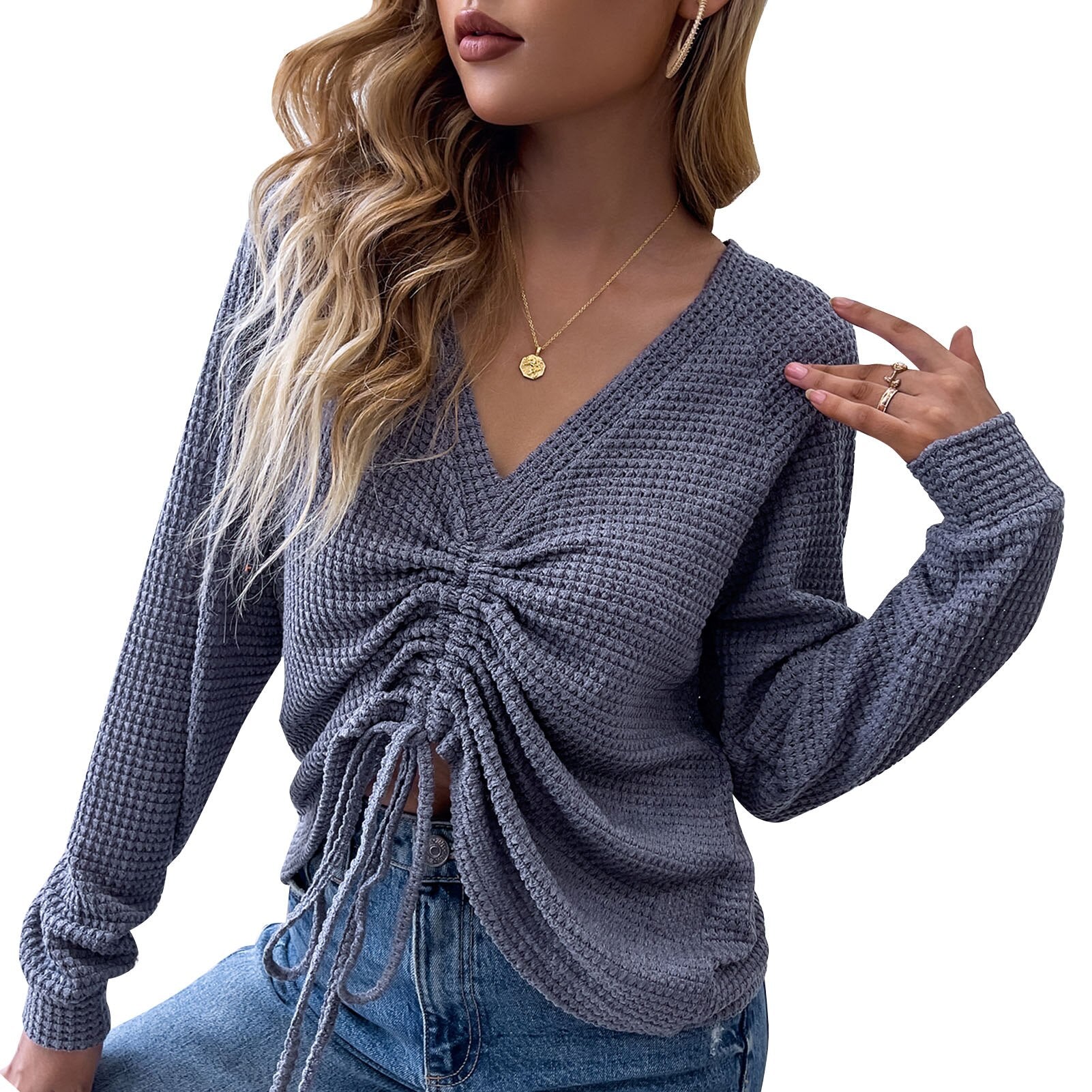 Loose pullover with V neck and raglan long sleeve for autumn and spring. The drawstring design at the front shows ruched detailing and allows you to adjust the length to have a cropped style. Have it to pair jeans for streets.