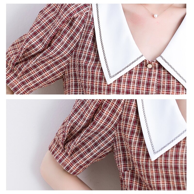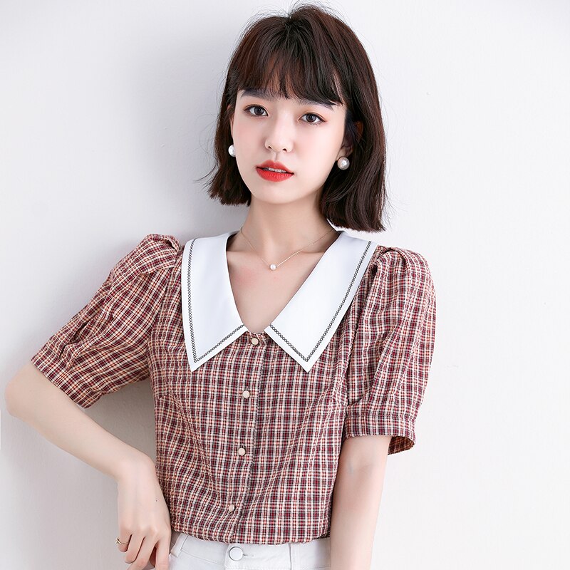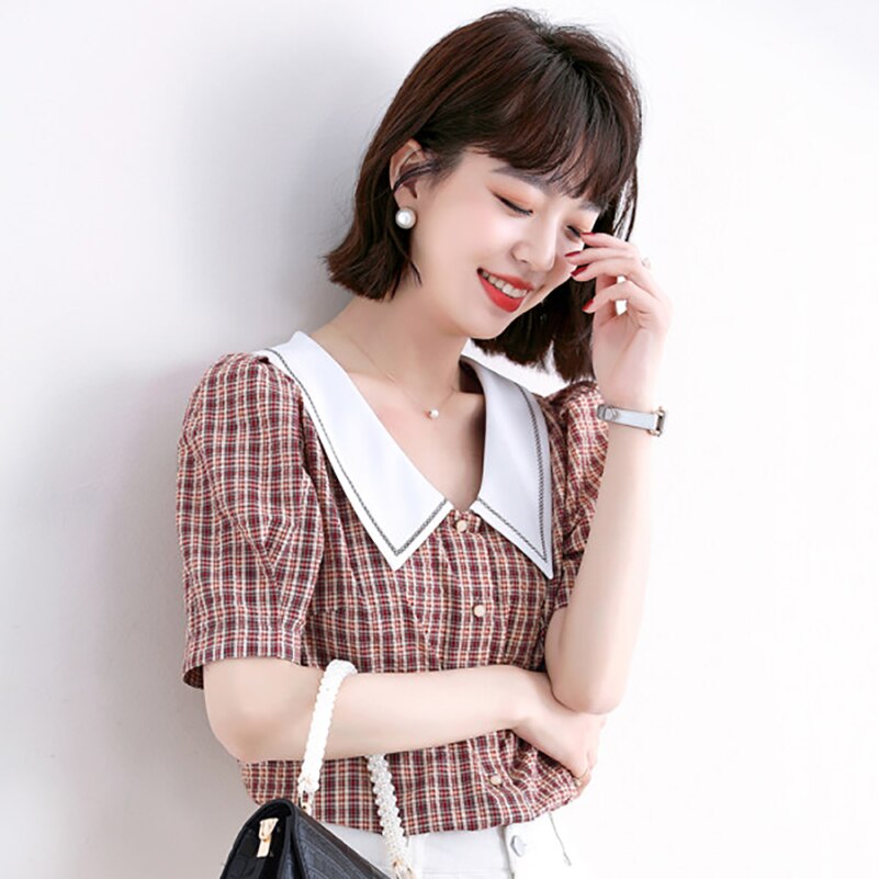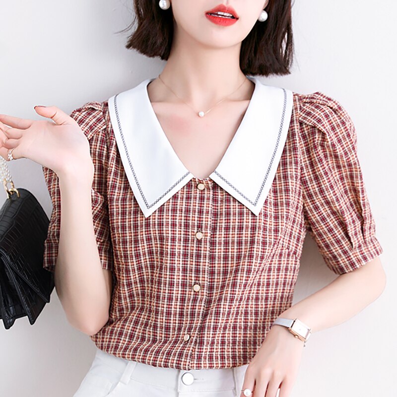 Women Chiffon Blouses 2021 Fashion Summer Style Casual Shirts Lady Short Sleeve Peter Pan Collar Plaid Chiffon Puff Sleeve Tops