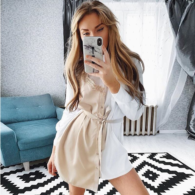 Women Lace Patchwork Shirts Dress Office Ladies Long Sleeve Sashes Single Breasted Dress Femme Autumn Mini Party A Line Dress