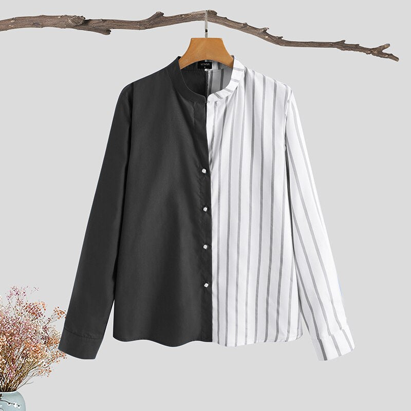 Women Shirts 2021 VONDA Sexy V Neck Long Sleeve Casual Striped Tops Casual Pleated Button Up Shirts Blouse Blusas Femininas