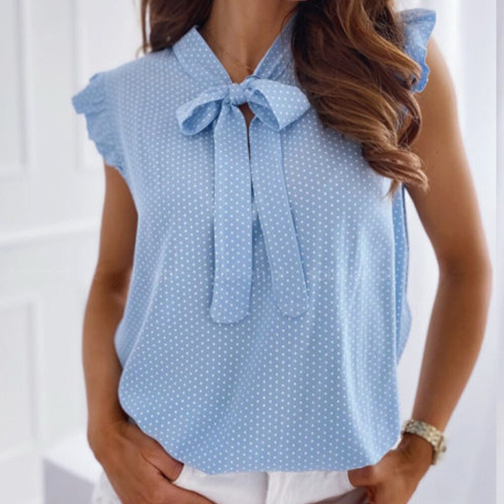 -Feature: Sleeveless, Pleated Armhole, Polka Dots, Knot Neck, Tie Neck, Boho, Casual