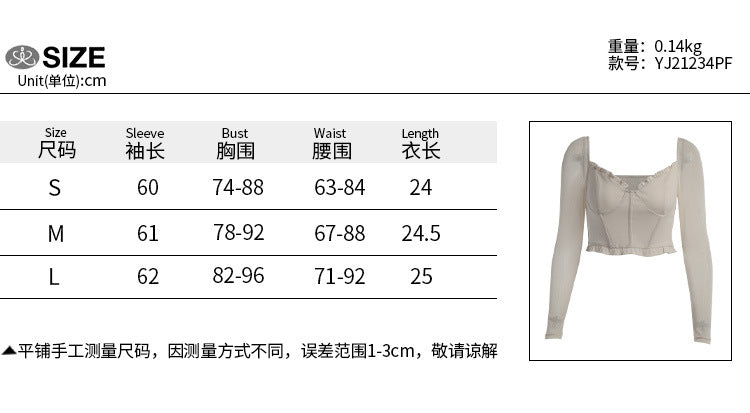 Y2K 2022 Spring Fall Fashion Net Yarn Square Neck Black Long Sleeves Women's Blouses Sexy Tank Cropped Casual Tops Shirts Tee