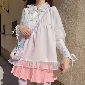 • Japanese Fungus Ruched Lolita Blouses Women 2022 Mori Girl Sweet Lantern Sleeve Tops Fresh Kawaii White Shirts Spring