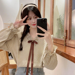 • New Sweet Fungus Edge Tops Long Sleeve 2022 Vintage Plaid Shirts Fresh Mori Girl Lace Up Bow Blouses Spring Women All Match