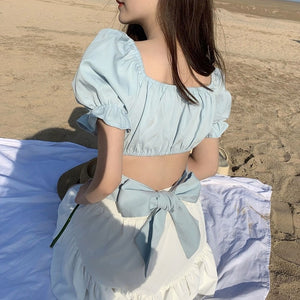 Casual Korean Elegant Blouses Women Backless Bule Sexy Chic Sweet Cute Shirts Puff Sleeve Bow Bandage Fashion Designer Beach Top