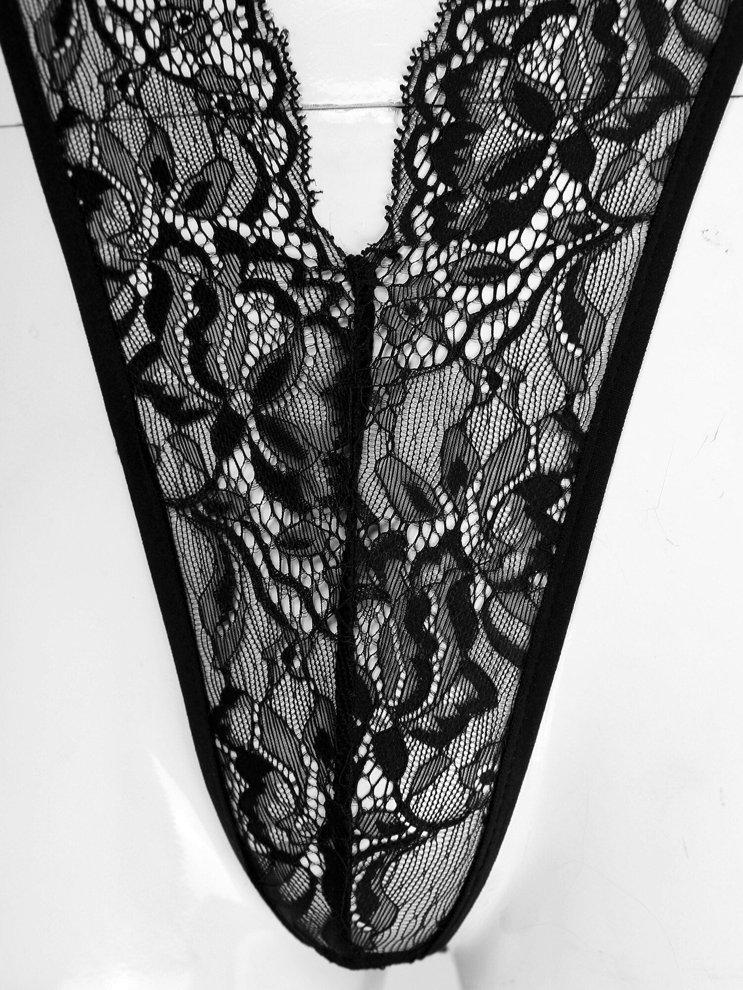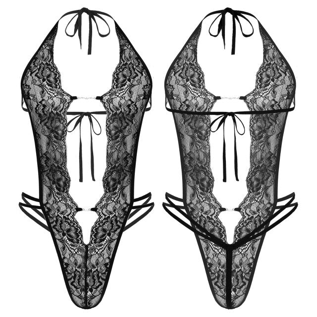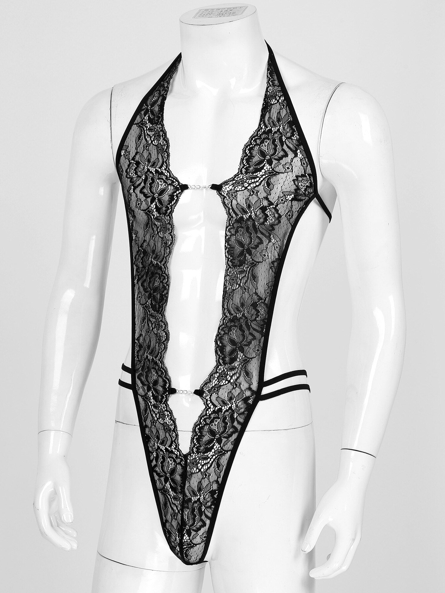 Mens Deep V Sheer Floral Lace Bodysuit Lace-up Backless Leotard Sissy Crossdress Nightwear.