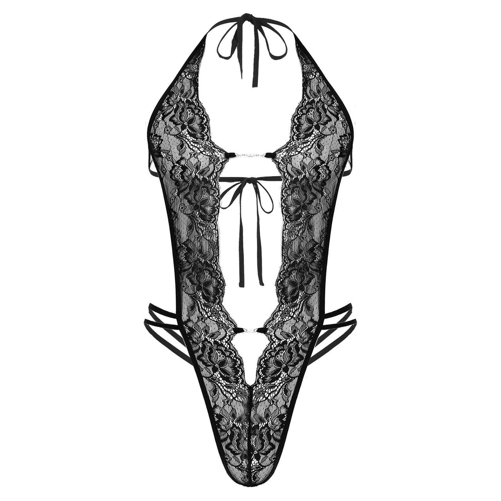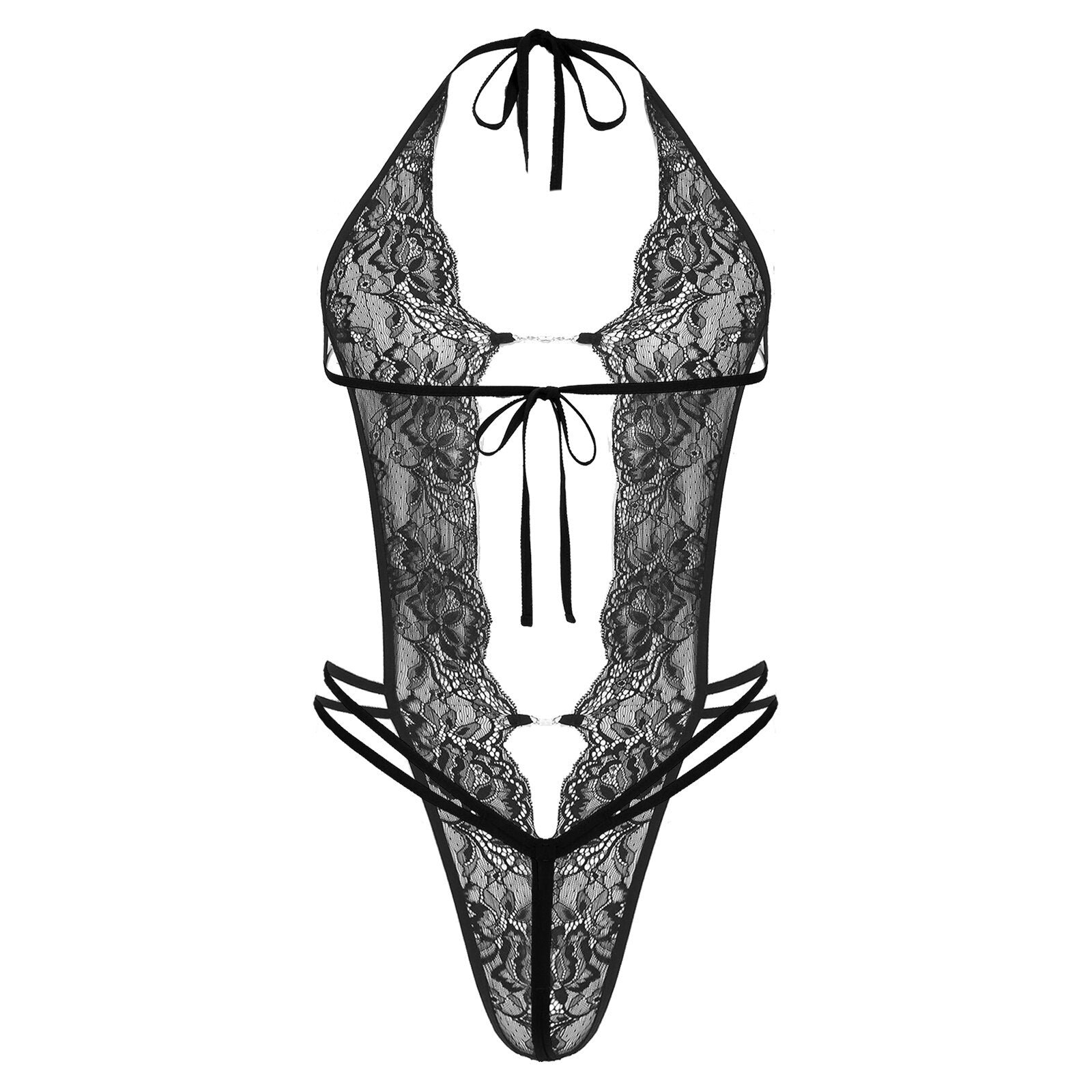 This bodysuit features deep v halter neck, metal chain in the front, see-through lace and backless design.