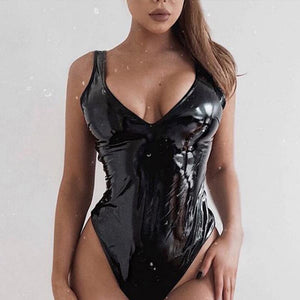 2021 Black PU Leather Women Bodysuit Sleeveless Sexy Bodycon Top Female Party Clubwear V Neck Strapless Bodysuits Gothic