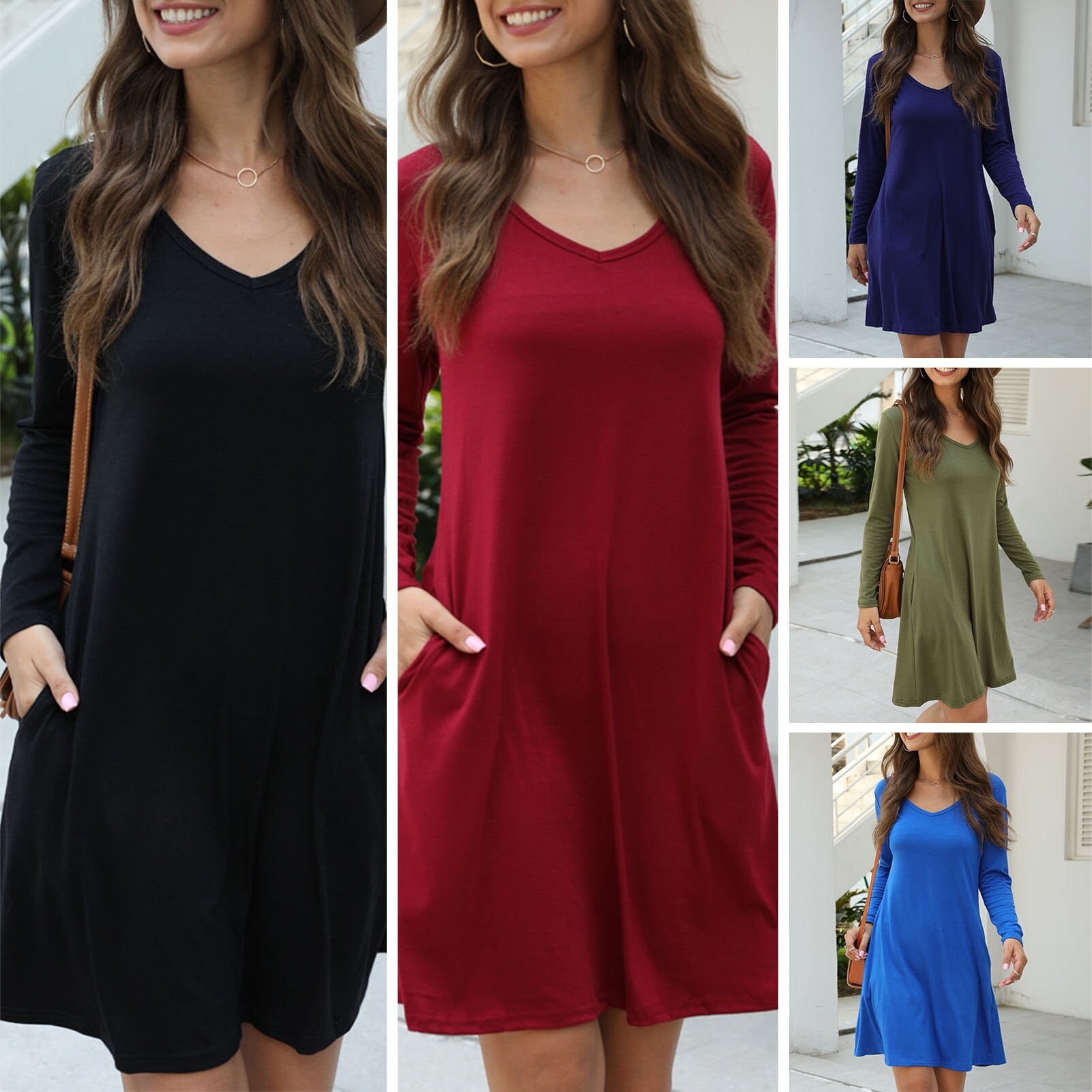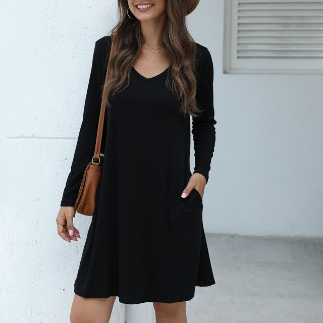 Simple shifted dress with V neck, long sleeves, and side pockets. You can pair it with flats or high heels for different styles.
