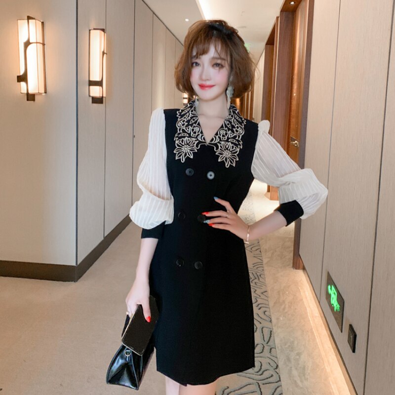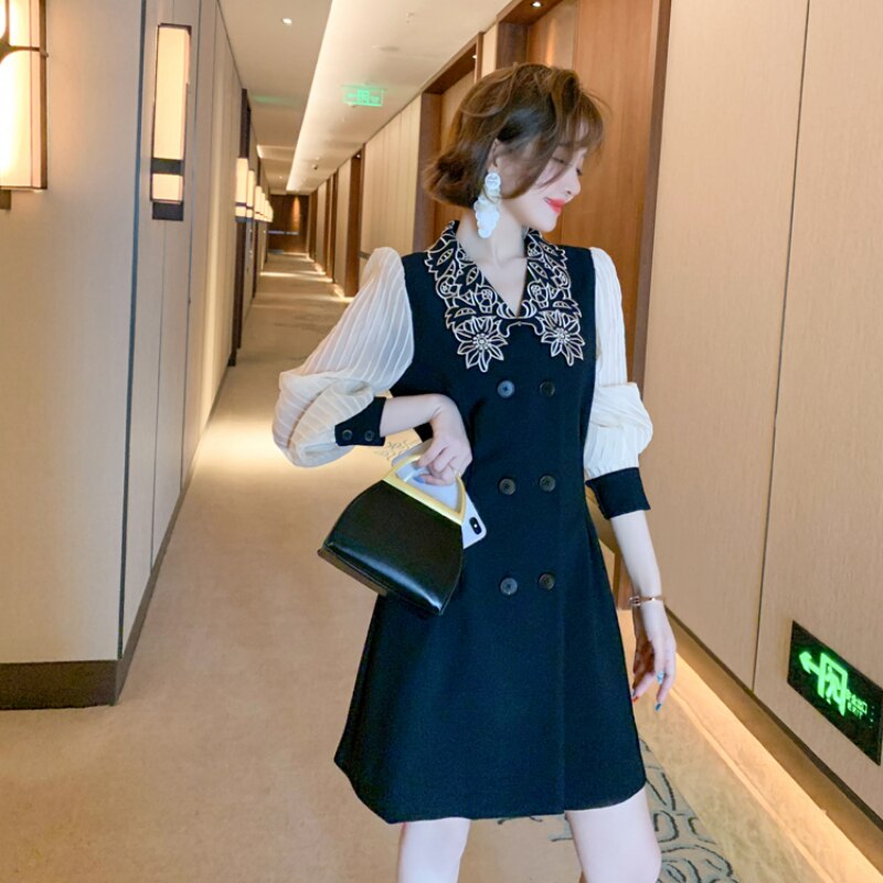 Fashion Embroidery Flower Lantern Long Sleeve Double Breasted High Waist Patchwork Elegant Party Dress Women Vestidos