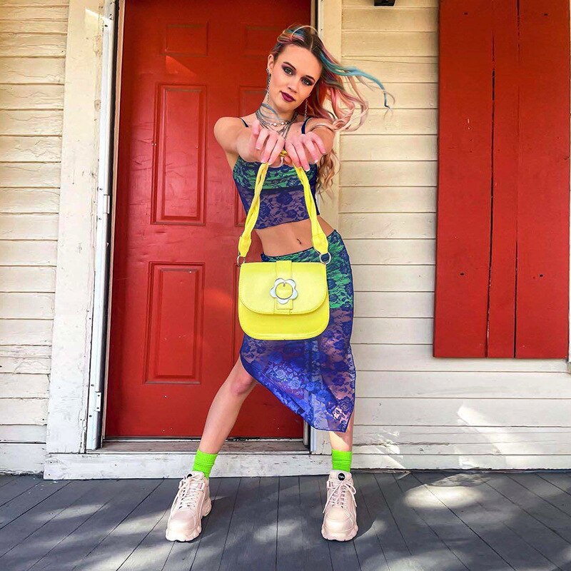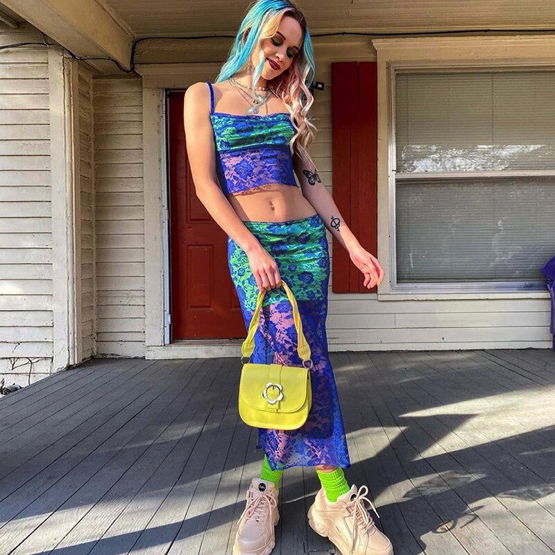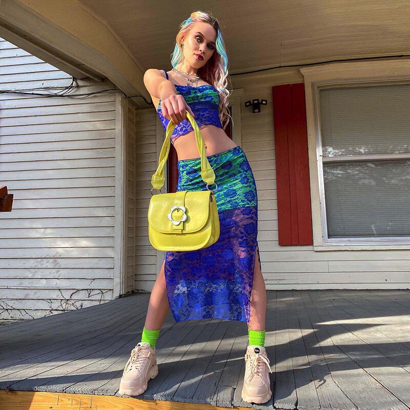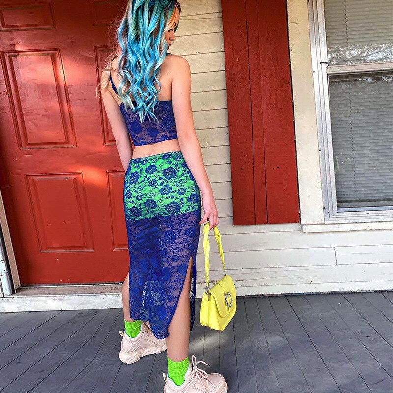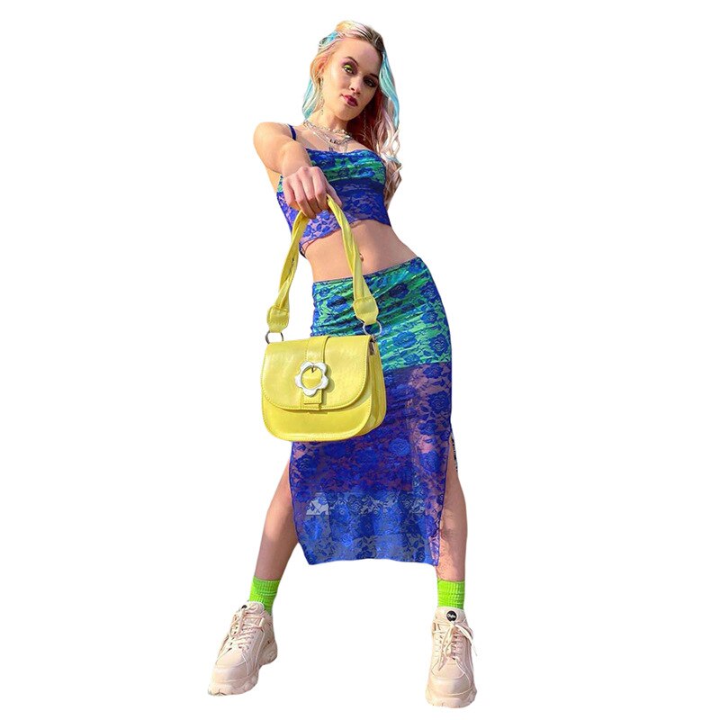Blue lace knitted two piece dress set Strap hollow out sexy crop top high split midi skirt Elegant party women clothing outfits