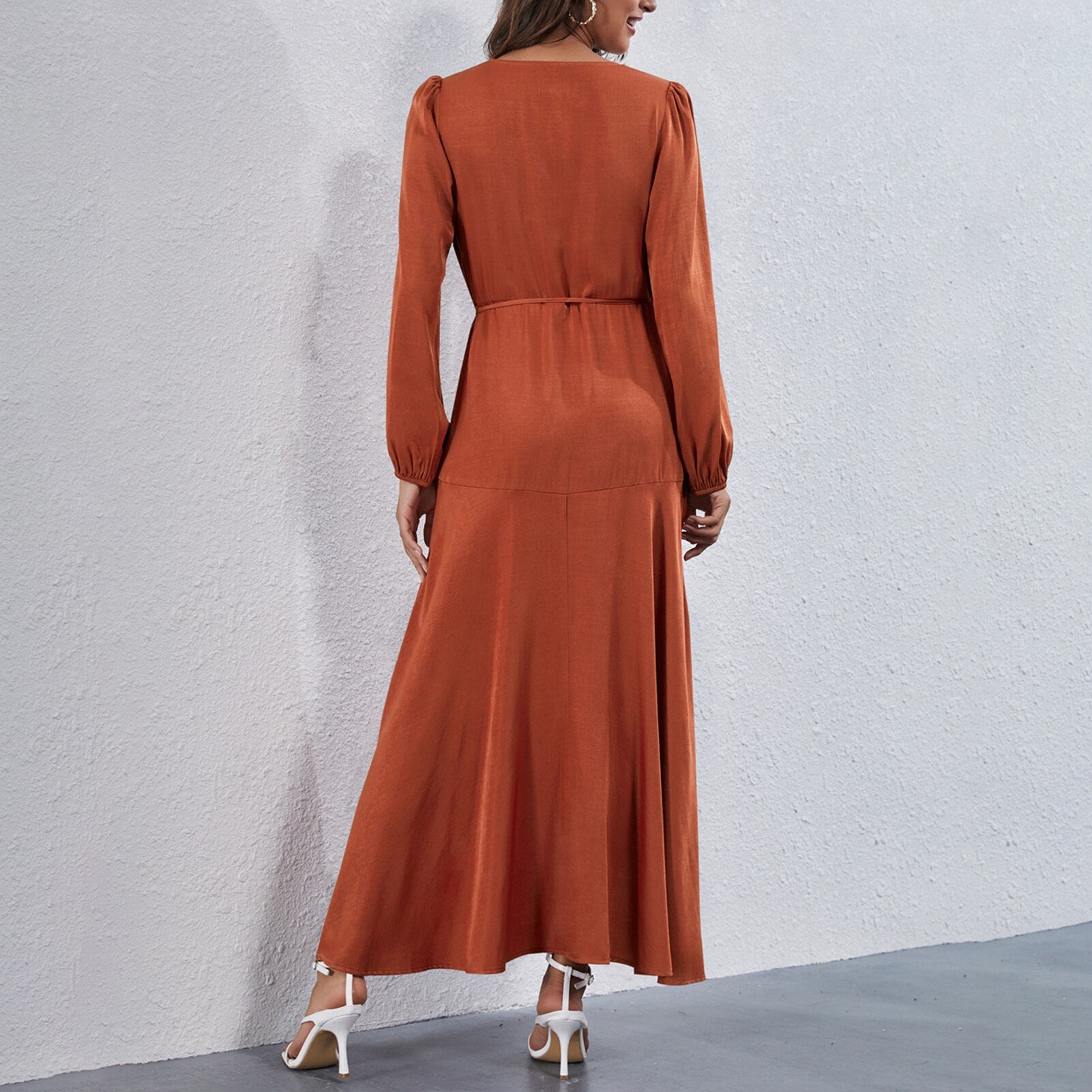 Dress in solid color featuring V neck, long sleeves, high waist and irregular hem is quite elegant and fashion. A nice dress for dinner or party.