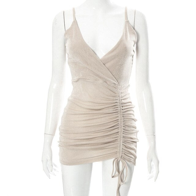 Elegant Sexy Folds Drawstring Women Dress Pure Apricot V Neck Sleeveless Party Dress Backless High Waist Vestido 2022 Summer