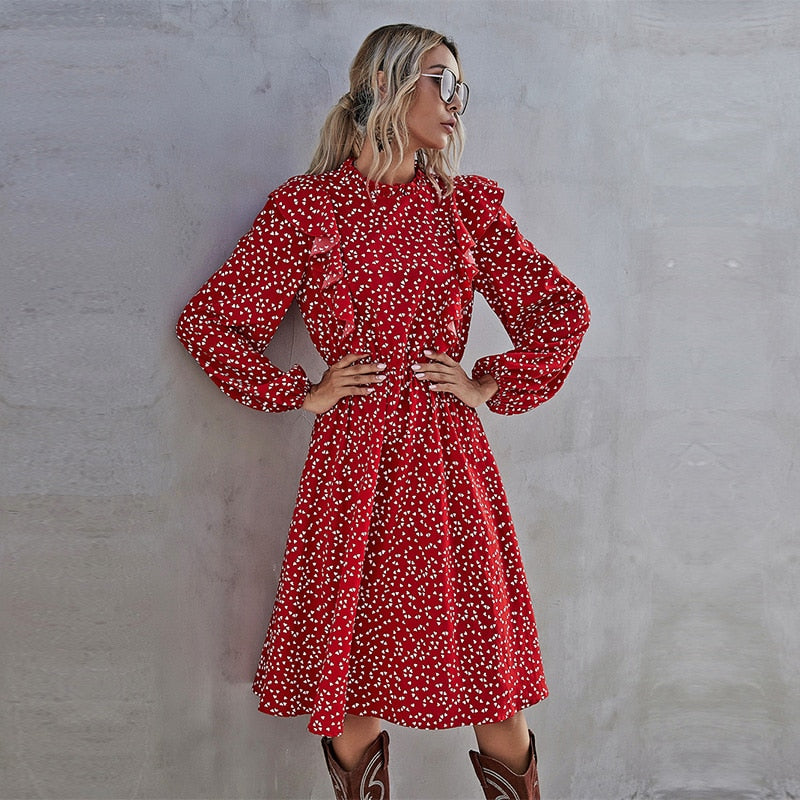 Fashion New Ruffles Heart Dot Print Dress Women Elegant Full Sleeve High Waist Ladies 2021 Spring Summer Long Dress Red