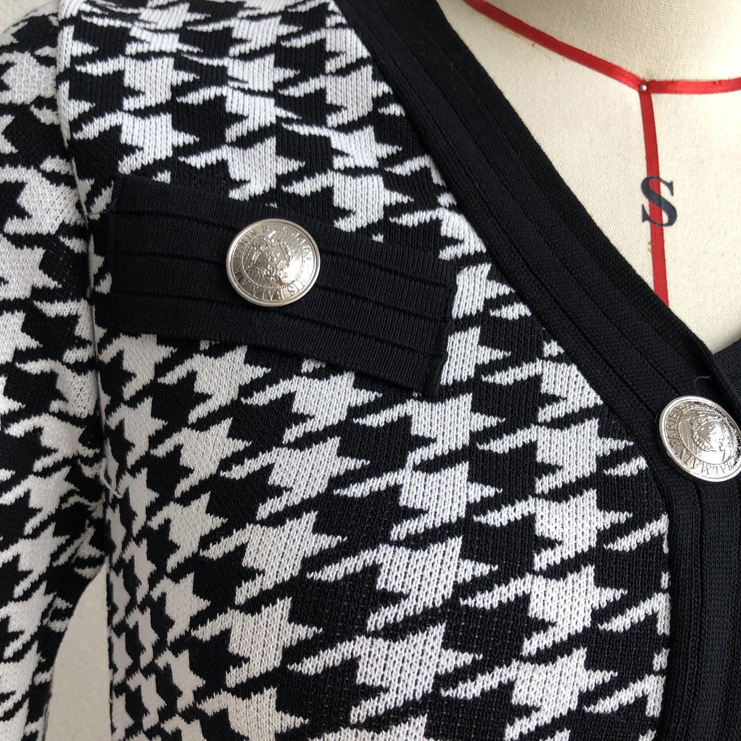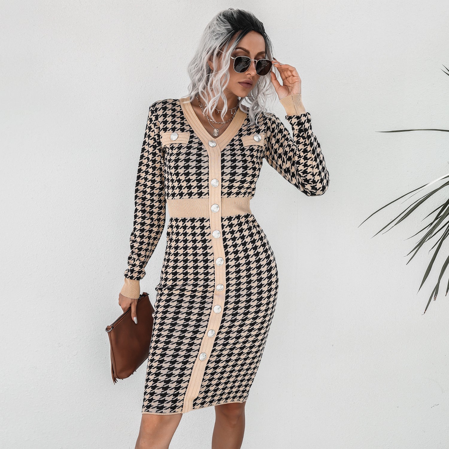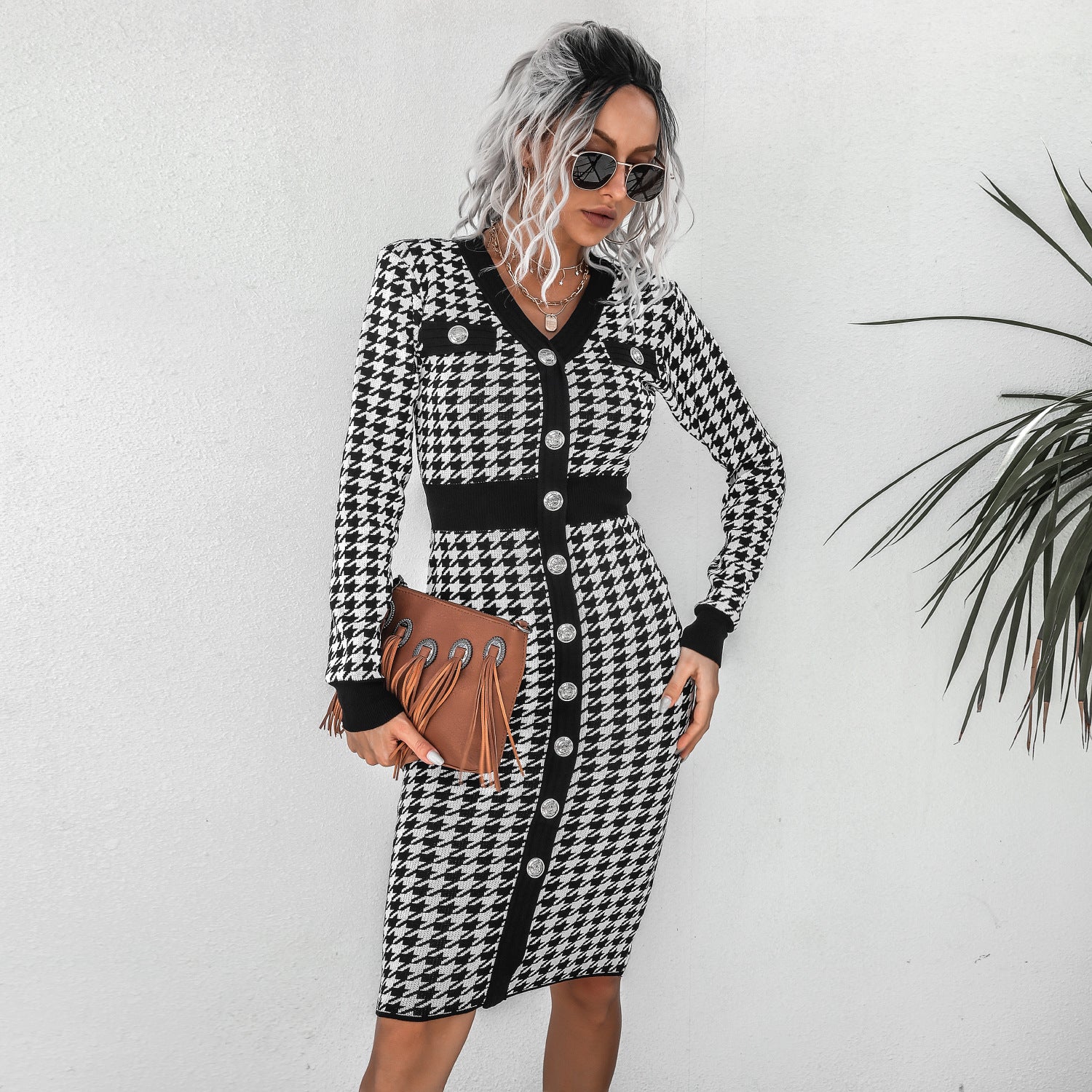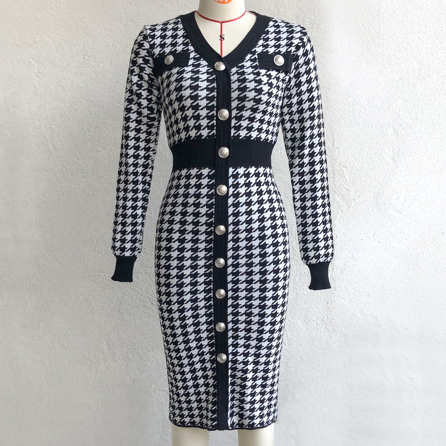 Free Size Slim Fit Ladies Office Wear Casual Women Houndstooth Knit Sweater Dress