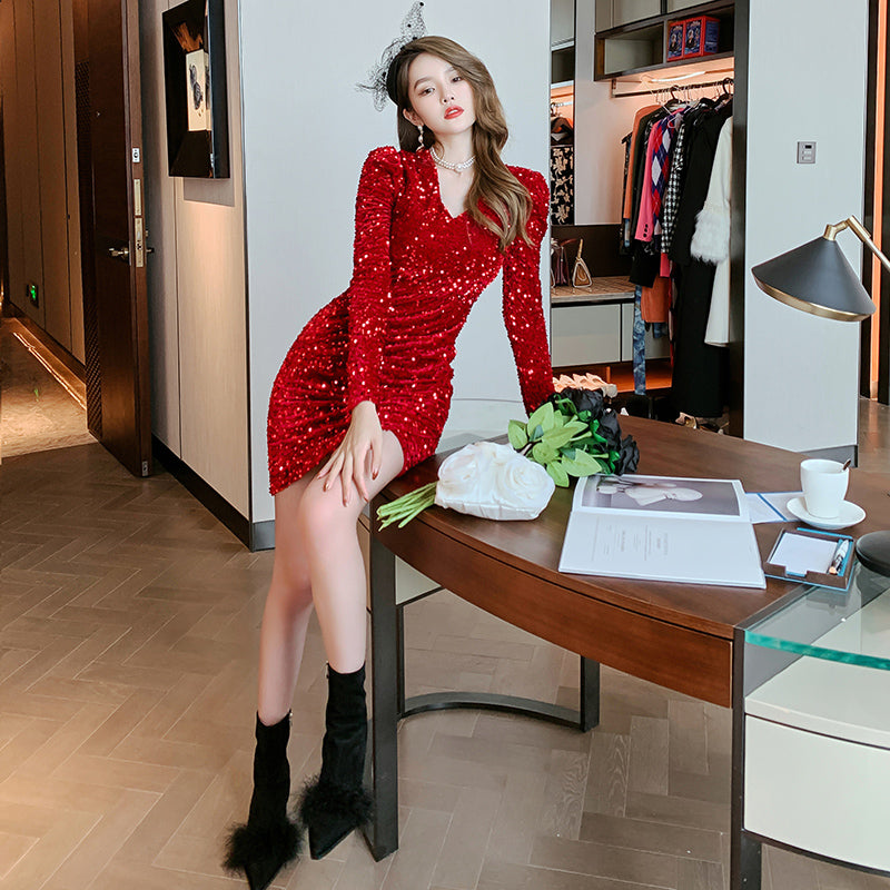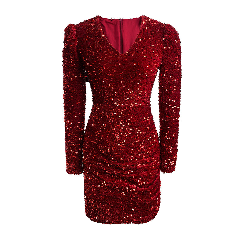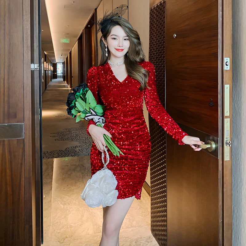 Hot Selling Burgundy Sparkling Sexy Sequined Dress Long Sleeves Christmas