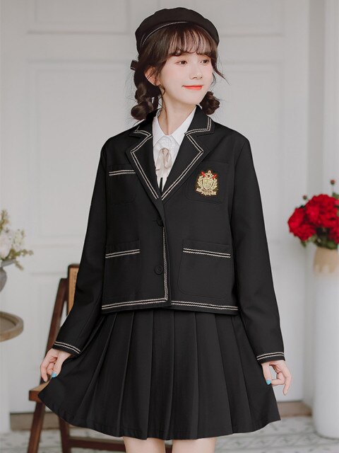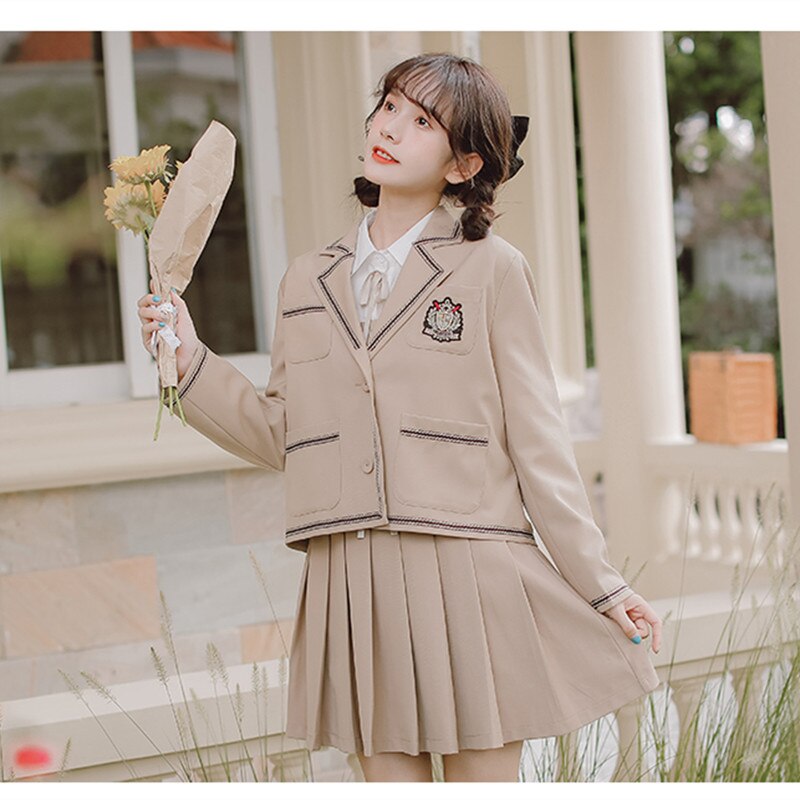 Japanese Girl JK Uniform Set Fall Women Long Sleeve Suit Collar Embroidered Coat Top+Shirt Stitching Pleated Dress Set Autumn