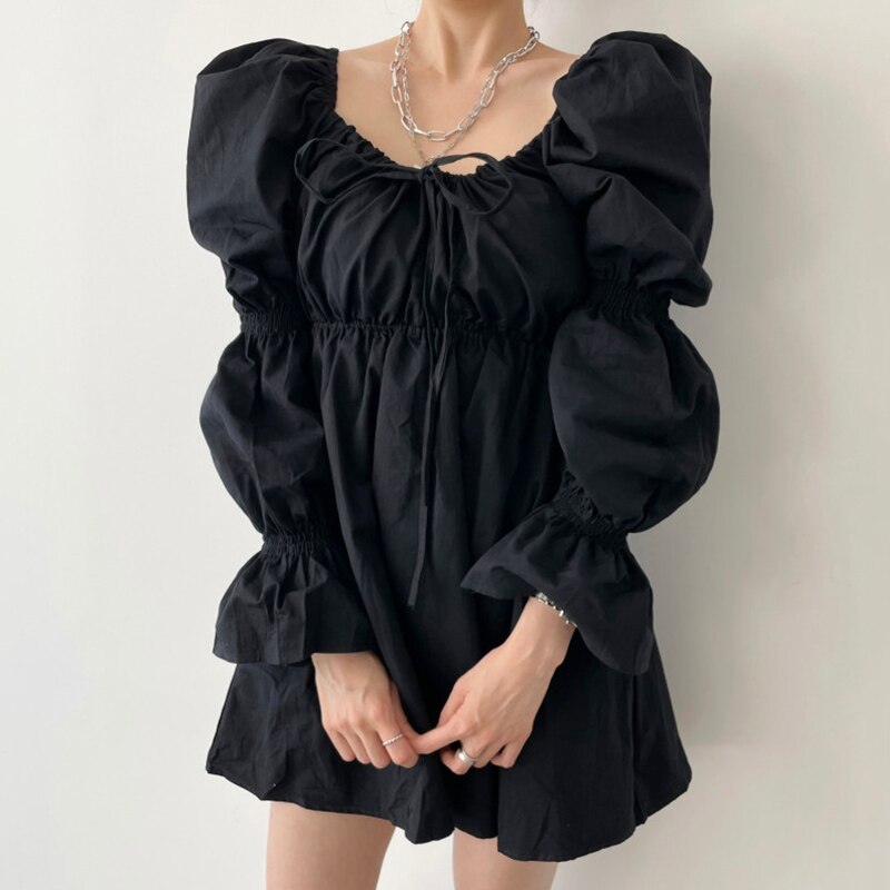 Korean Chic Autumn Retro Square Neck Women Dress Fold Drawstring Lace Up High Waist Short Flare Sleeve Vestidos Elegant Robe
