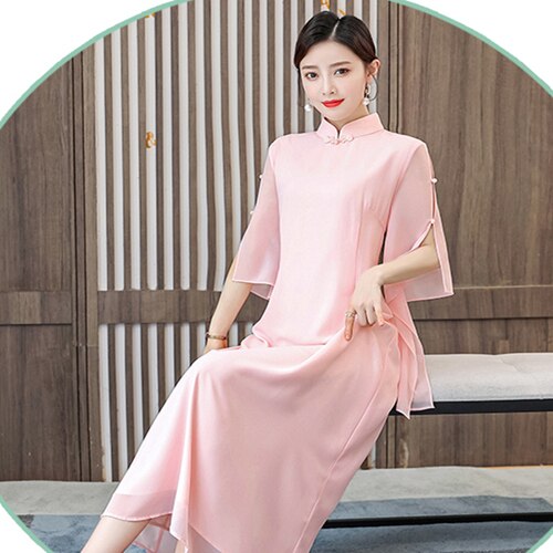 Ladies Elegant Chiffon Improved Cheongsam Women Stand Collar Irregular Sleeve Solid Slim Midi Dress Chinese Style Women Clothes