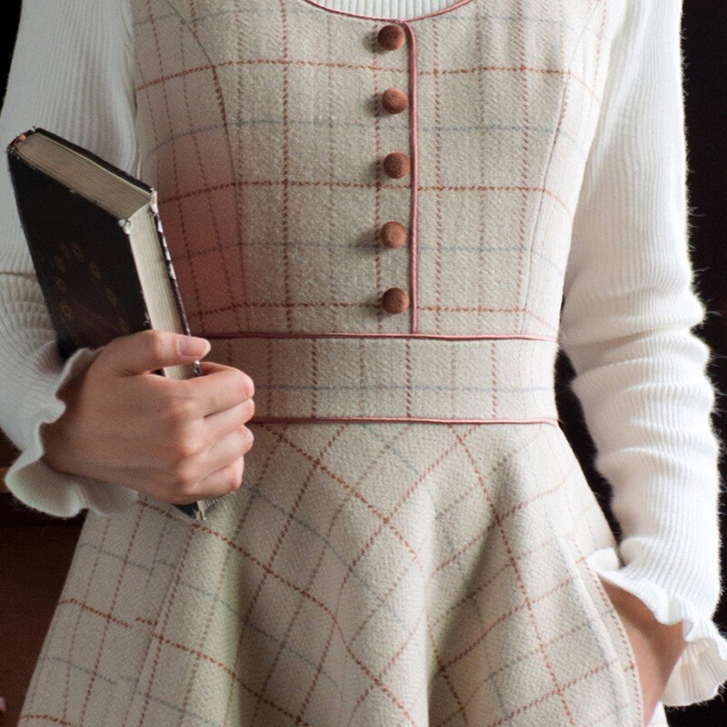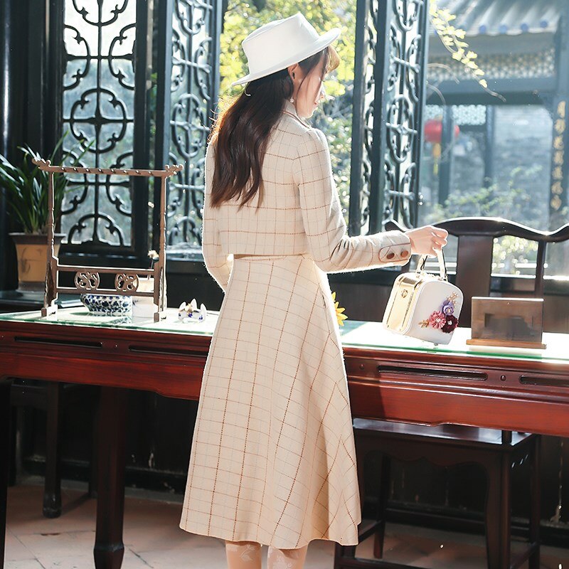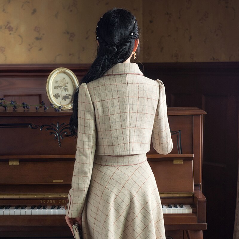 Ladies Winter Retro Suit Short Jacket Plaid Bowknot Double Breasted Top + Waist Strap Dress 2-piece Set
