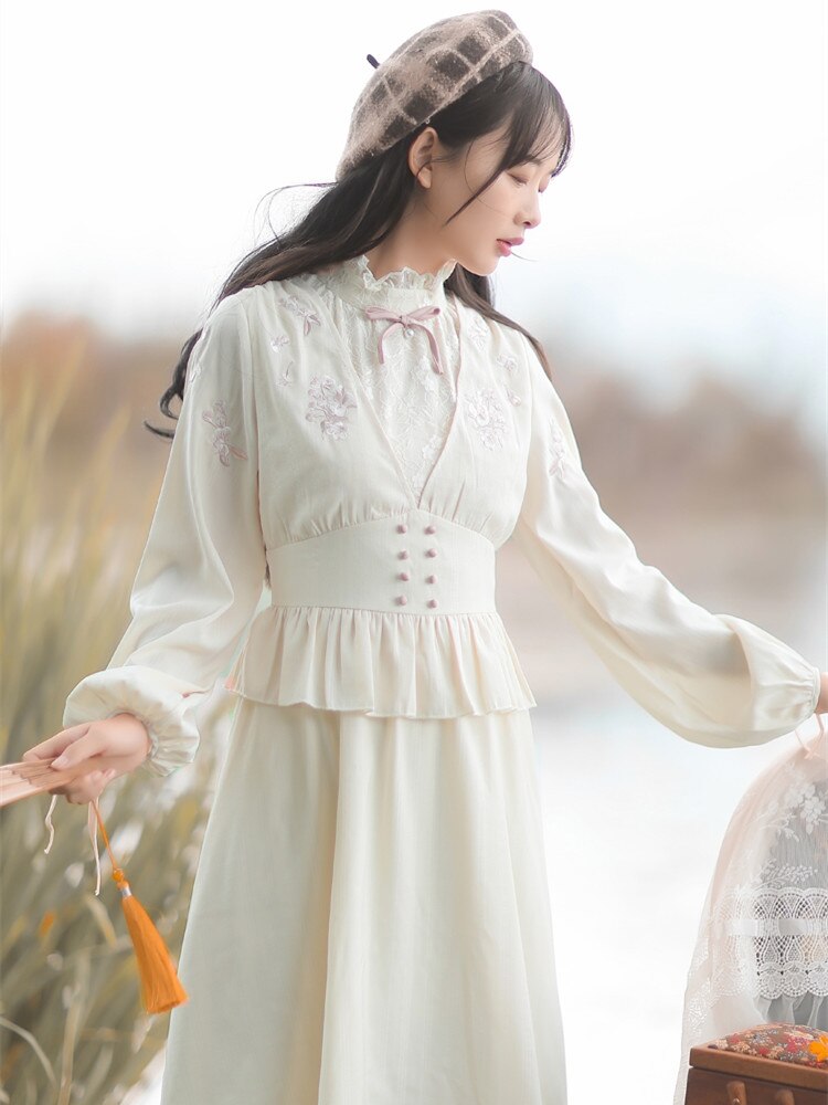 Lolita Sweet Fairy Dress Female Flower Embroidery Chinese Style Retro Ruffle Stand Collar Elegant Puff Sleeve Dress Y2K Fall