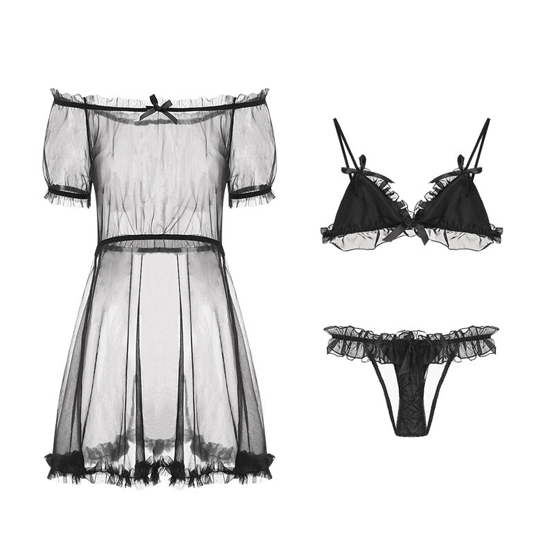New women gauze perspective bow shoulder sexy three hot temptation set of three exotic Nightdress bras panties see through cute