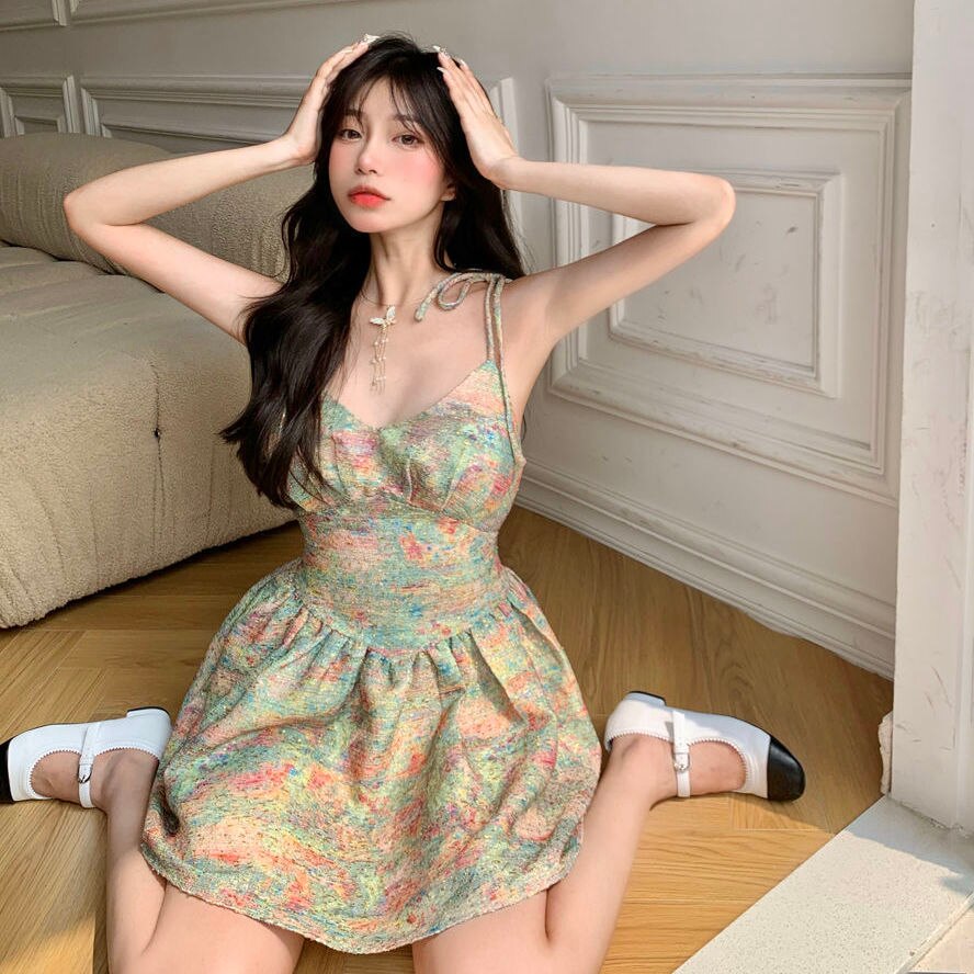 Retro Gentle Style Sweet Floral Spaghetti Strap Dress Women Summer 2021 New Style Jumpsuit Short Dress Waist Puffy Dress