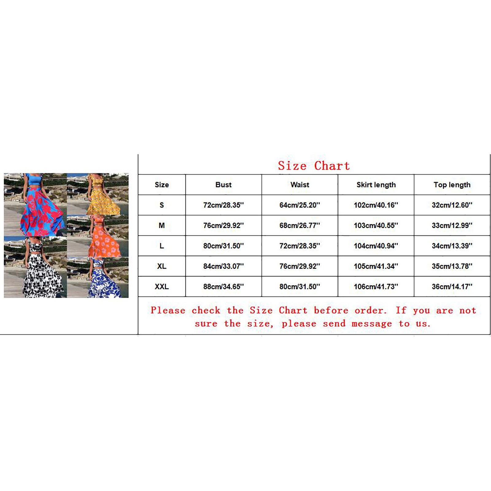 | Size | US | UK | EU | Bust | Waist | Skirt length | Top length |