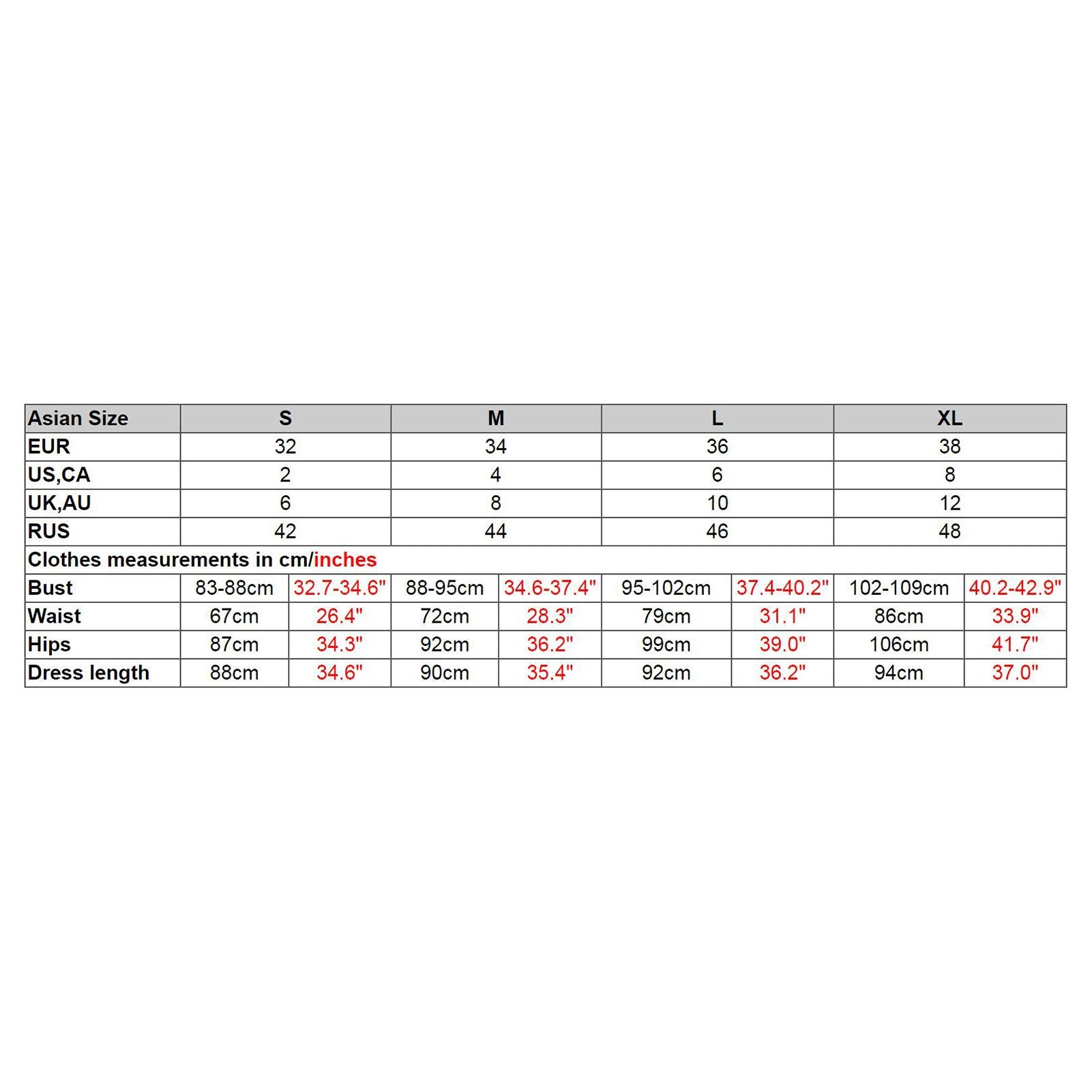 | Dress length | 88cm | 34.6" | 90cm | 35.4" | 92cm | 36.2" | 94cm | 37.0" |