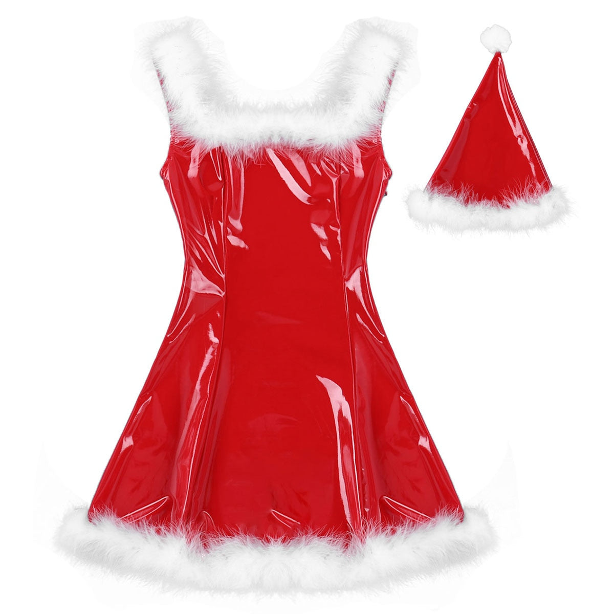 Women’s Christmas fancy dress Mrs Santa Claus Xmas party costume dress with hat, wet look appearance.