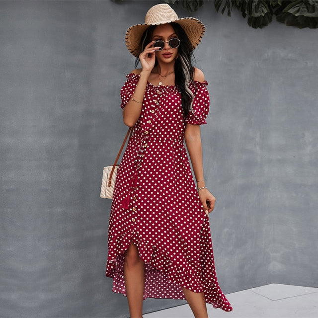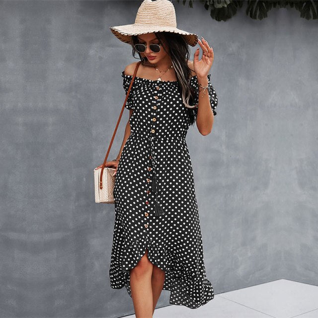 Spring 2021 New Ladies Dot Polka Print Dress Women Tassel Button Off The Shoulder Dress For Woman Sexy Slash Neck Summer Dress