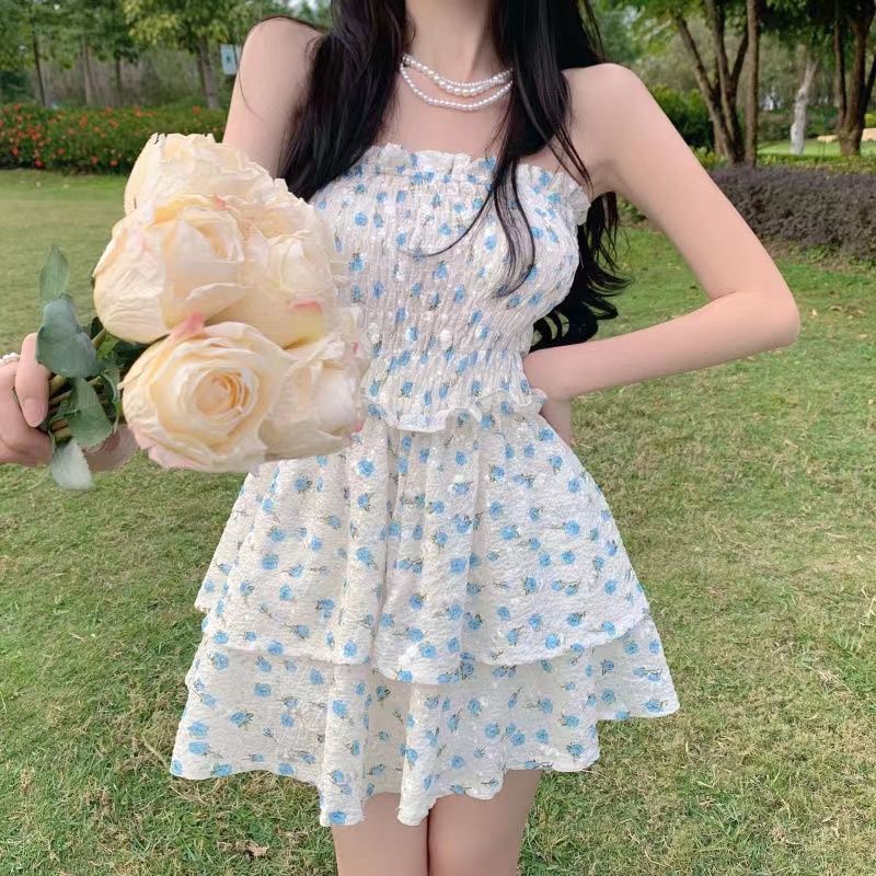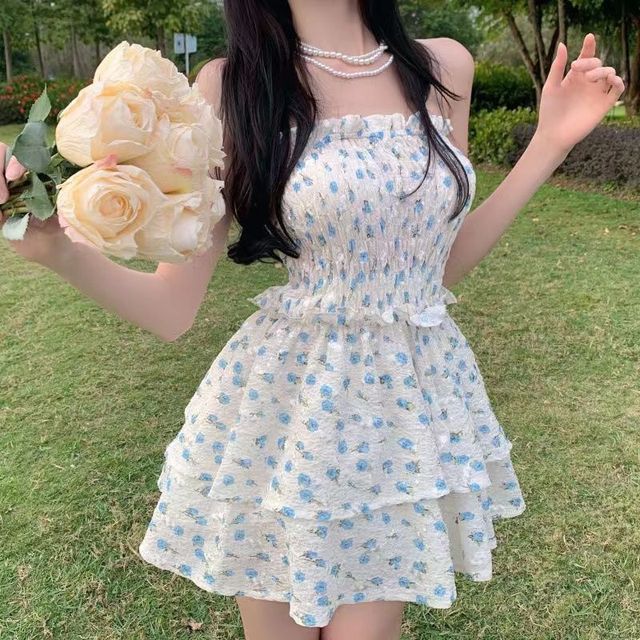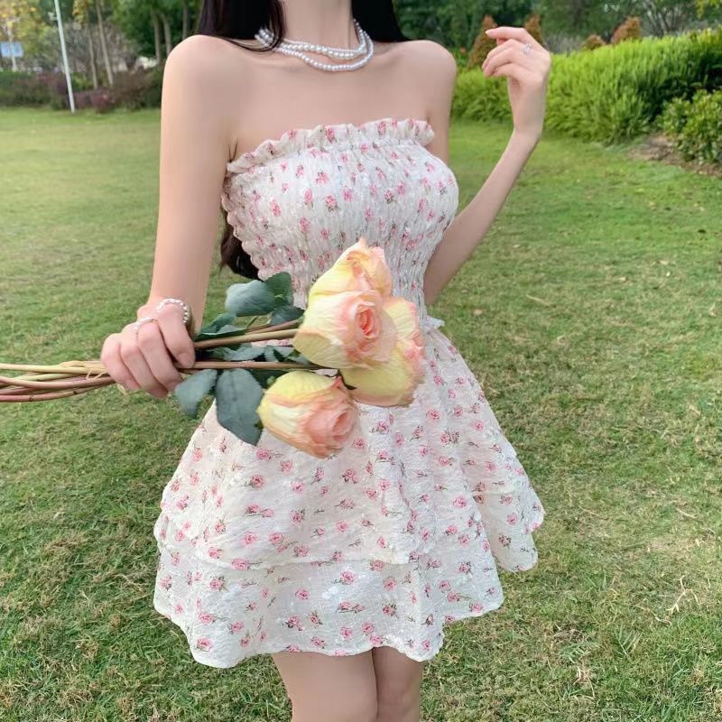 Summer 2022 Sexy Bandeau Kawaii Princess Dress Women Japanese Ruffle Sleeveless Sweet Girl Floral Dress Casual Korean Clothing