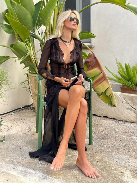 Summer Beach Dress Women Elegant Bandage Ruffles Slim Maxi Dress 2022 New Sexy Blue Long Sleeve Evening Party Dress Club Outfits
