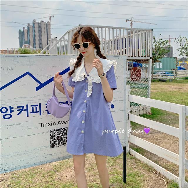 Summer Dress Women Sweet Niche Peter Pan Collar French Elegant Short Sleeve Lace-Up Fairy One Piece Dress Korean 2021 Chic