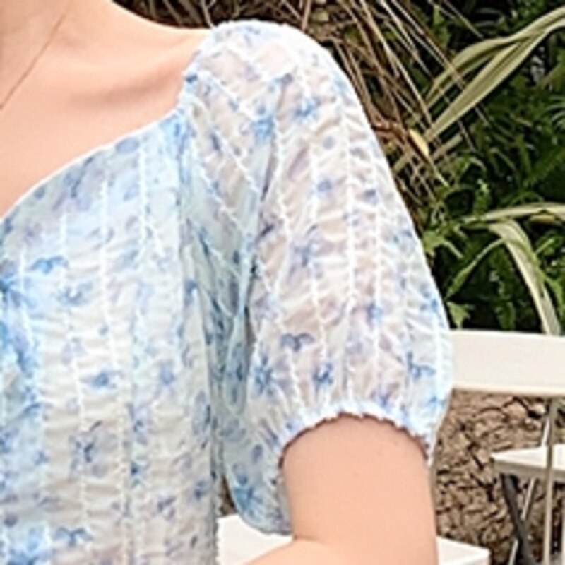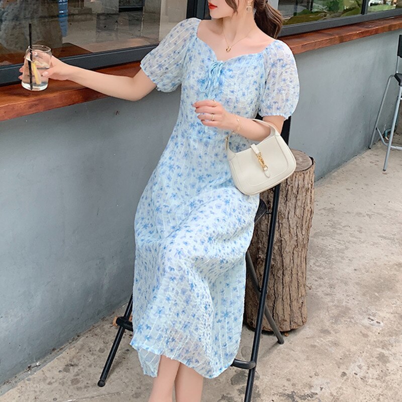 Summer Women Elegant Fashion A-line Print Robe Short Puff Sleeve Sexy V-neck Chiffon Dress Sweet Female DrawString Vestido Mujer