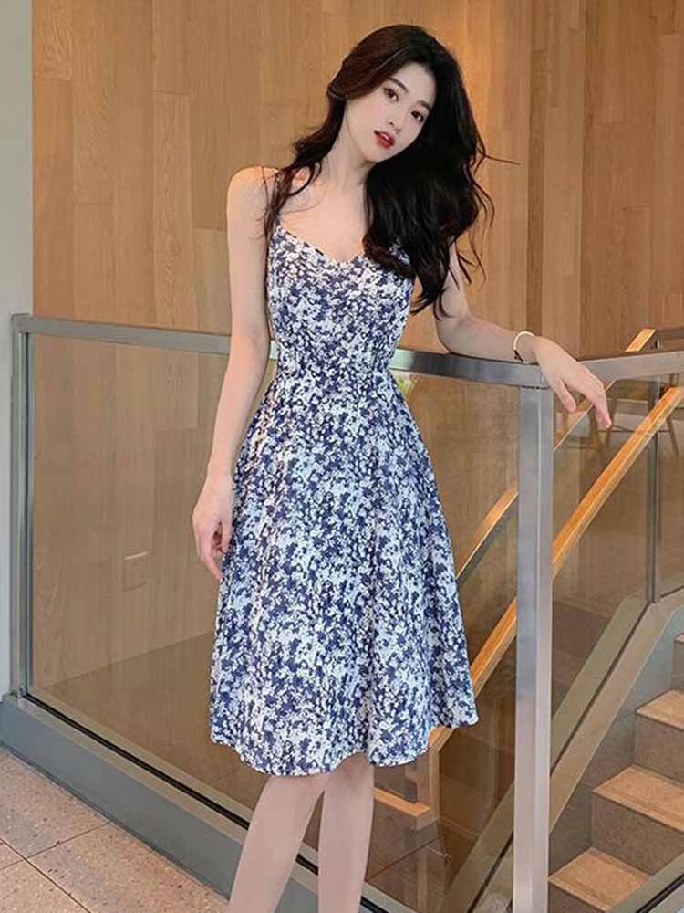 Summer Women's New Drawstring Skirt Bohemian Print Sexy Casual Fashion Holiday Skirt Sexy V-neck Open Back Knee Length Dress