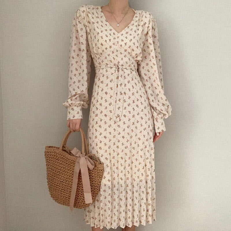 Sweet V-neck Floral Printing Dress Women Bandage Waist Slim Lantern Sleeve Chiffon Pleated Dress Vestidos Elegant Korean Robe