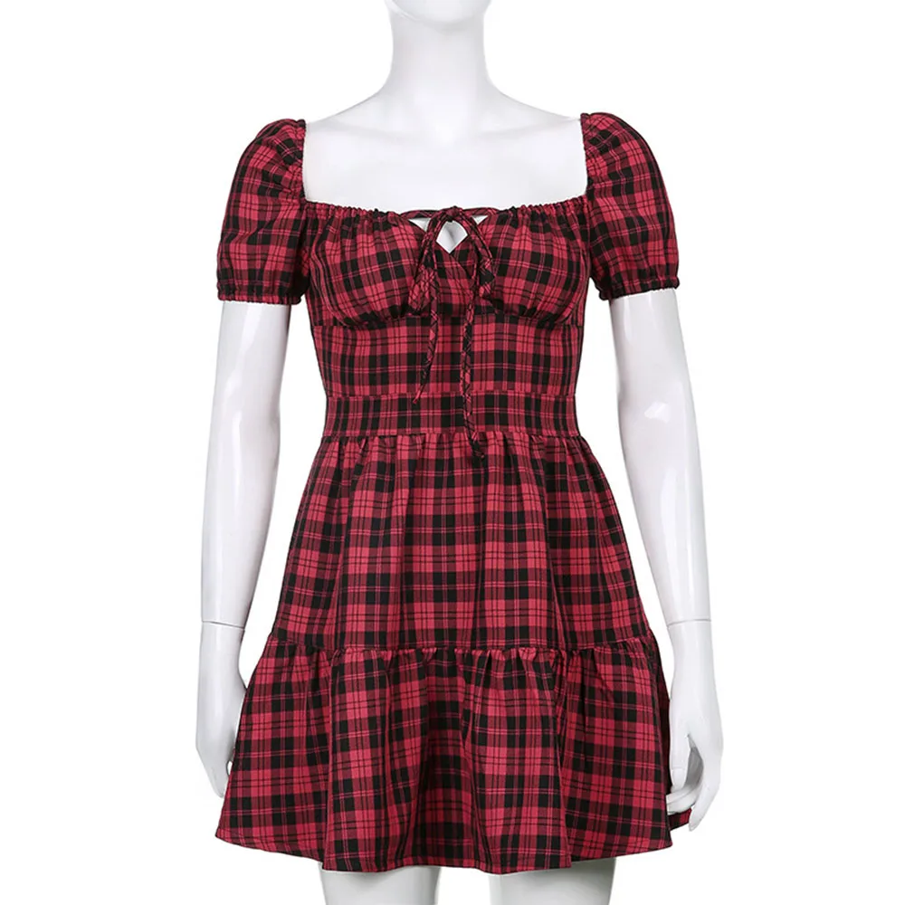 Western Style Summer New Square Collar Lattice Color Contrast High Waist Tight Lace High Waist Puff Sleeve Women's Dress