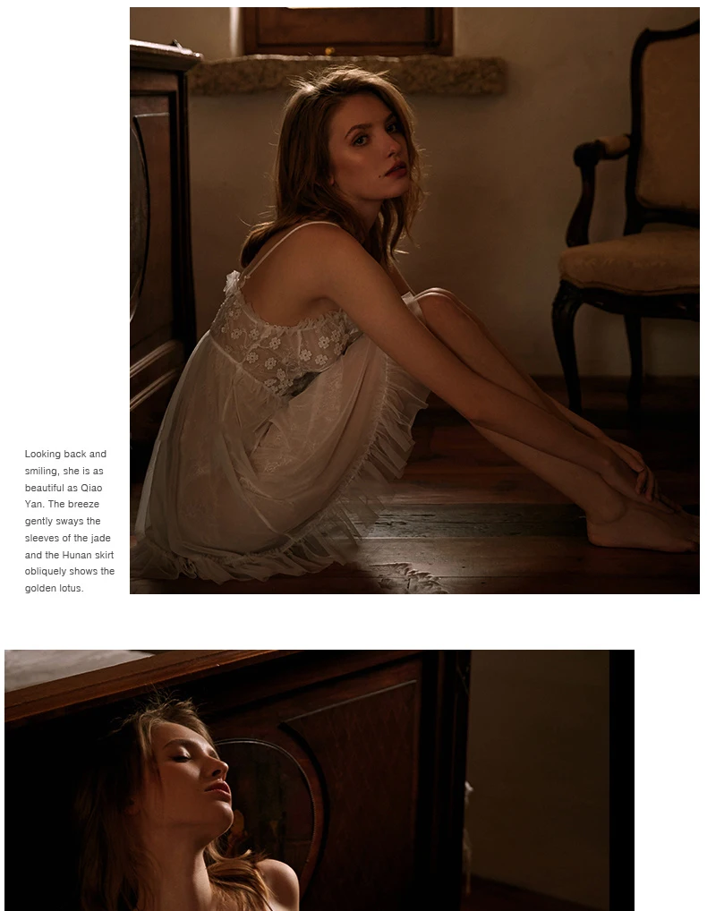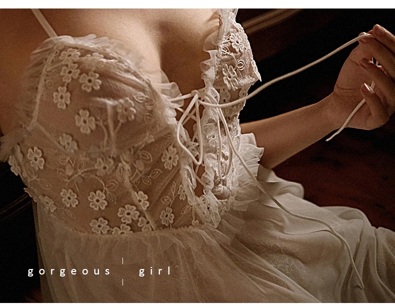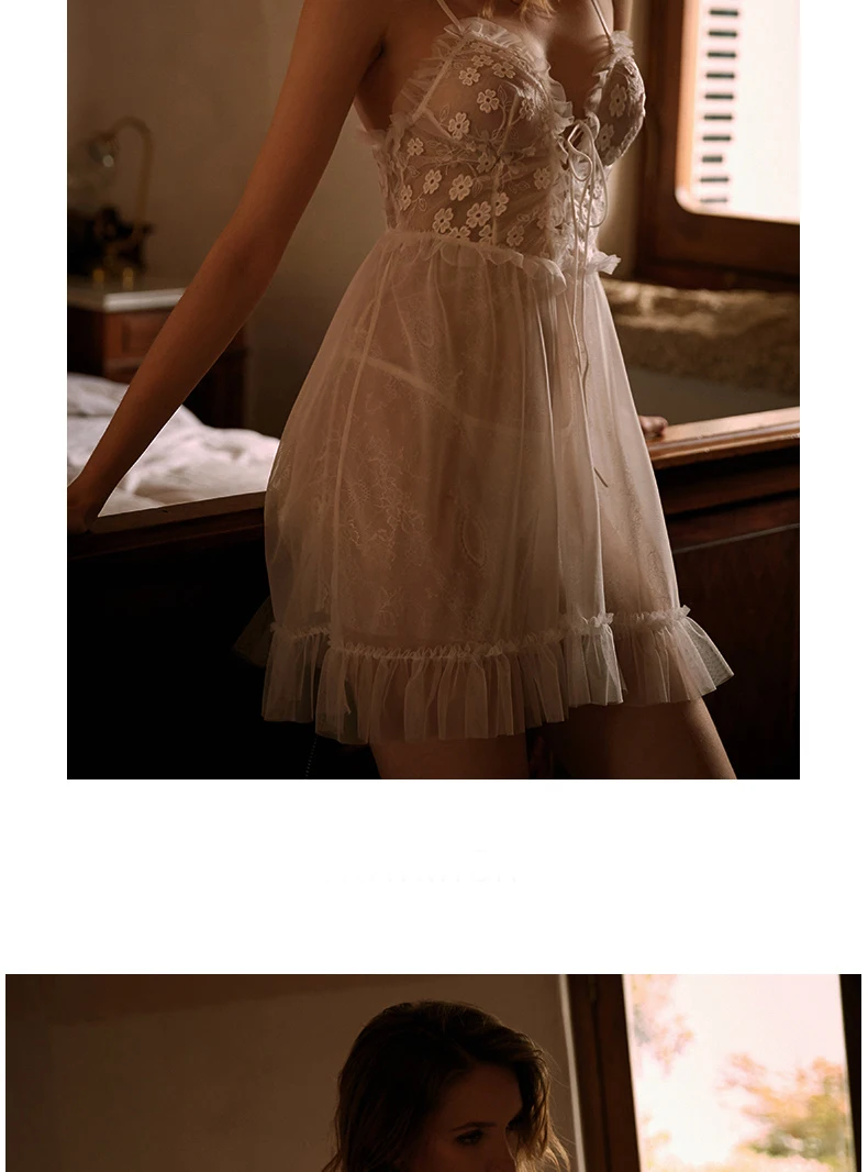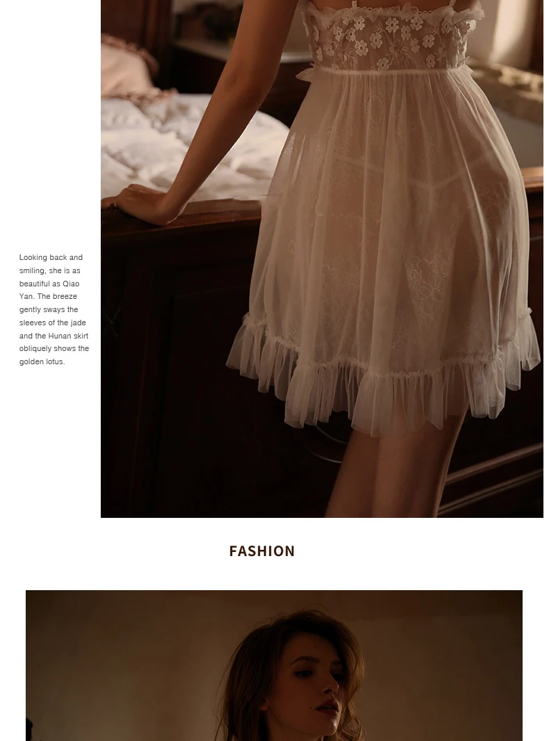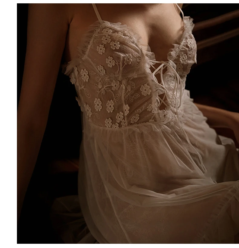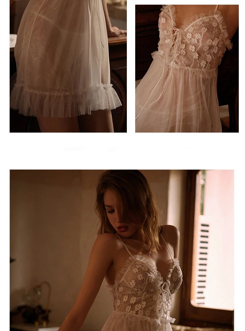 White Fairy Wedding Strap Nightdress Women Sexy Lingerie Lace Embroidered Beauty Back Temptation Nightwear with Panty Dropship