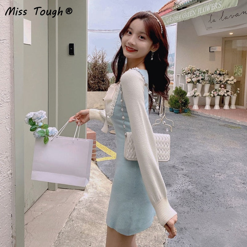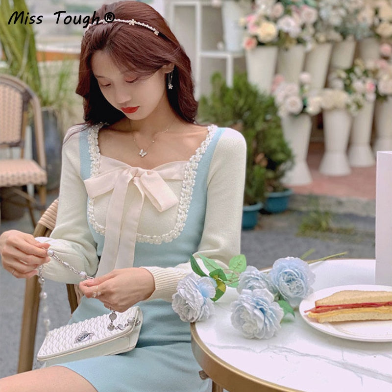 Winter Kawaii Knitted Dress Women Bow Patchwork Sweet Party Mini Dress Female Korean Elegant Slim Knitwear Sweater Dress 2021